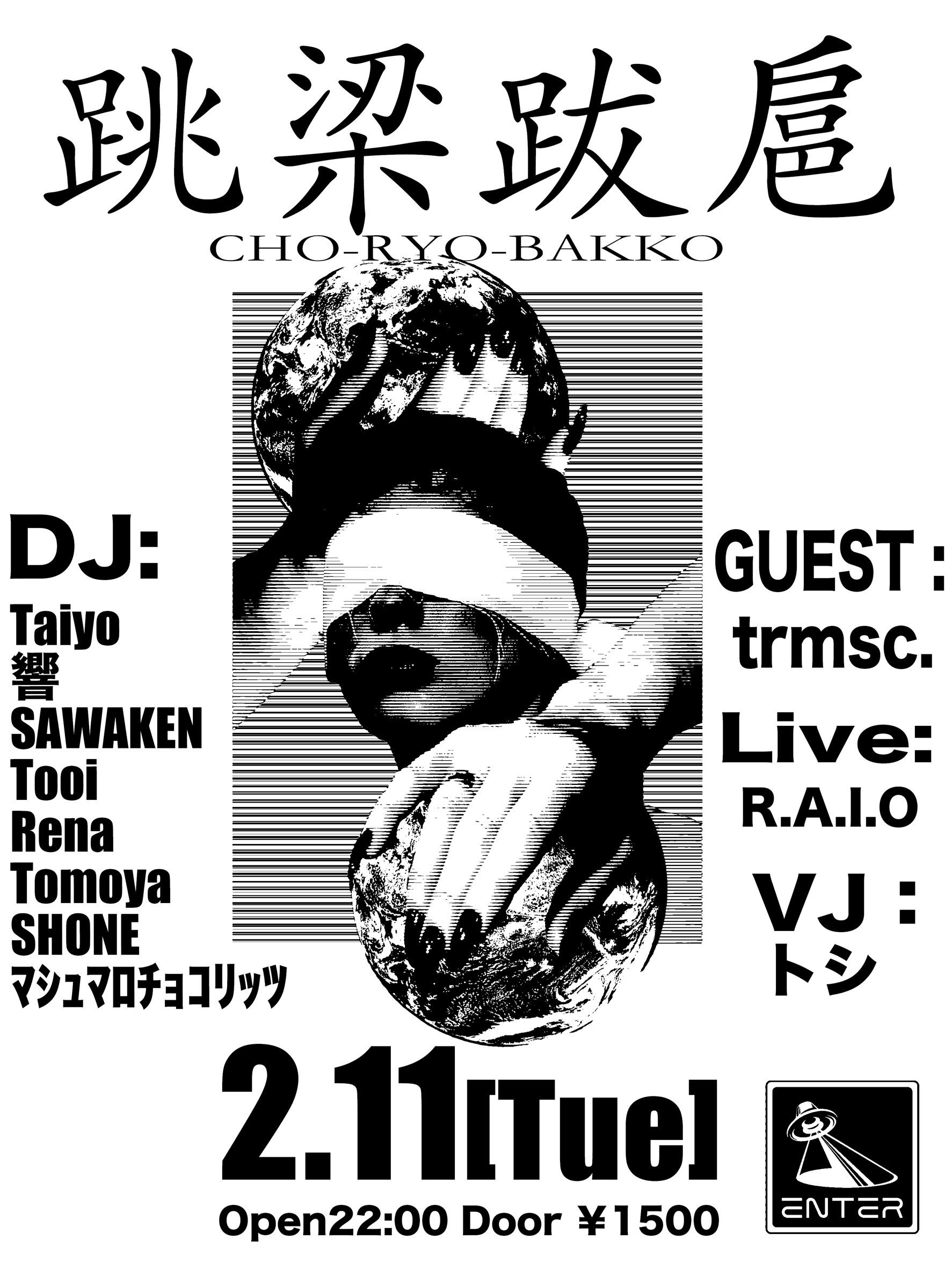 昨年7月、フォトグラファーTaiyo Tanidaと、グラフィックアーティストTooi の2人による初個展を締めくくるイベントとして開催された跳梁跋扈。今回はその第3弾を開催。跳梁跋扈とは、ほしいままに跳ね回る、行動することという意味合いがあり、その名の通りほしいままに突き進む自分たちの姿を表した。今回はスペシャルゲストとして、DJユニット暴走天使でも知られており、個人ではDJ/プロデューサーとして活躍しているtrmsc.が参戦!ハウス、テクノをベースに唯一無二のサウンドで、すべての心を震わせる。