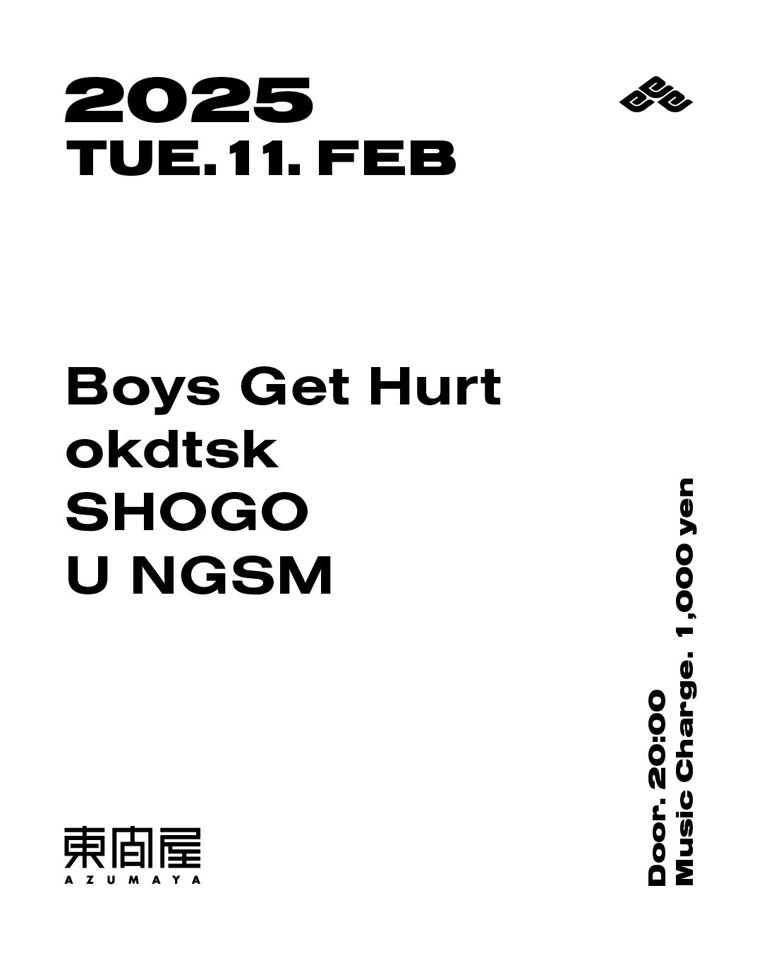 2025.02 11 FEB Azumaya -Tuesday- HOUSE 0 Shares Facebook Twitter google Line DATE: 2025-02-11 TUE OPEN: 20:00 VENUE: PRICE: Music Charge 1,000yen LINE UP: Boys Get Hurt okdtsk SHOGO U NGSM