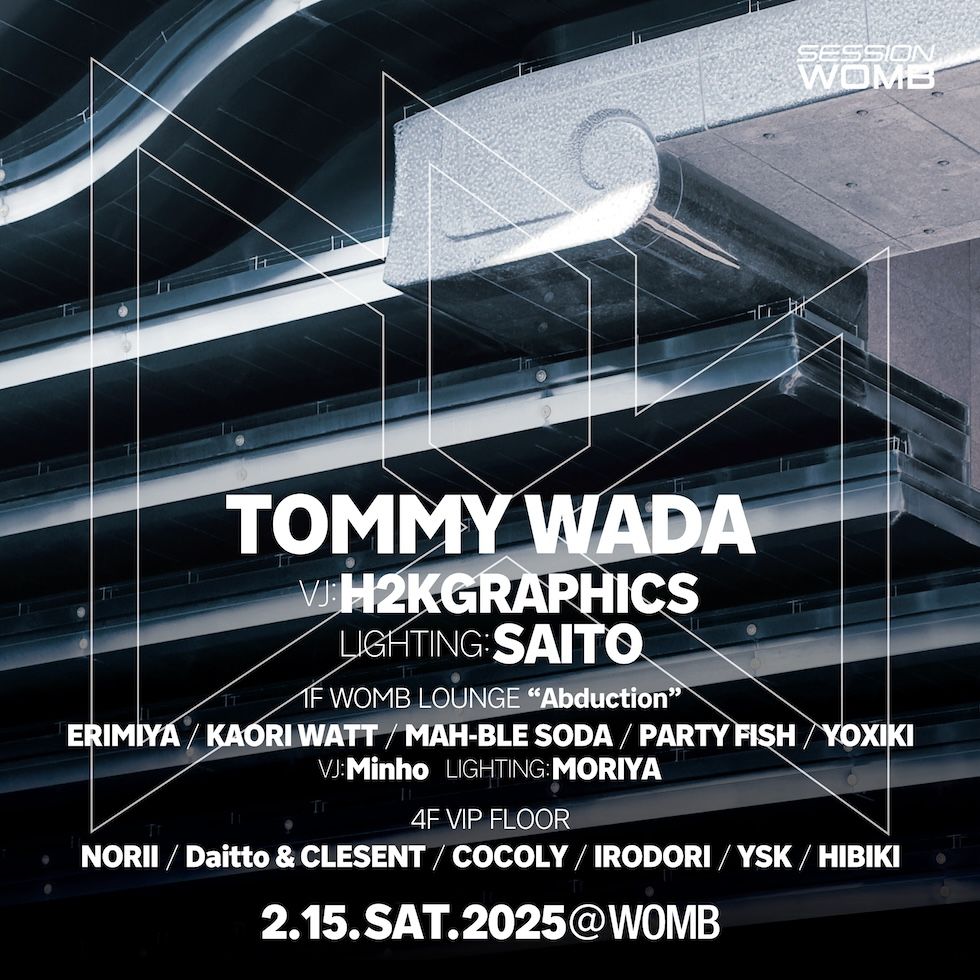 2025.02 15 FEB SESSION TECHNO 0 Shares Facebook Twitter google Line DATE: 2025-02-15 SAT OPEN: 23:00 VENUE: PRICE: DOOR: ¥3000 ADVANCE: ¥2500 LINE UP: 2F MAIN FLOOR TOMMY WADA VJ: H2KGRAPHICS LIGHTING: SAITO 4F VIP FLOOR NORII, DAITTO & CLESENT, COCOLY, IRODORI, YSK, HIBIKI 1F WOMB LOUNGE -ABDUCTION- ERIMIYA, KAORI WATT, MAH-BLE SODA, PARTY FISH, YOXIKI VJ: MINHO LIGHTING: MORIYA WOMB のレジデントパーティ SESSION (セッション)。2001年にスタートして以来、トライバルハウス、テクノ、ハウスと時代の進化に沿ったメインストリームの4つ打ちを中心に、これまでに国内外のDJたちが出演してきた。 今回はレジデントの TOMMY WADA がオープンからクローズまでフロアをメイク。また、TOMMY WADA のプレイとシンクする、H2KGRAPHICS による映像演出と、LIGHTING SAITO による光の演出が作り出す SESSION の世界観を五感で体感して欲しい。 1F は、Hard technoパーティー abduction がフロアをジャック。