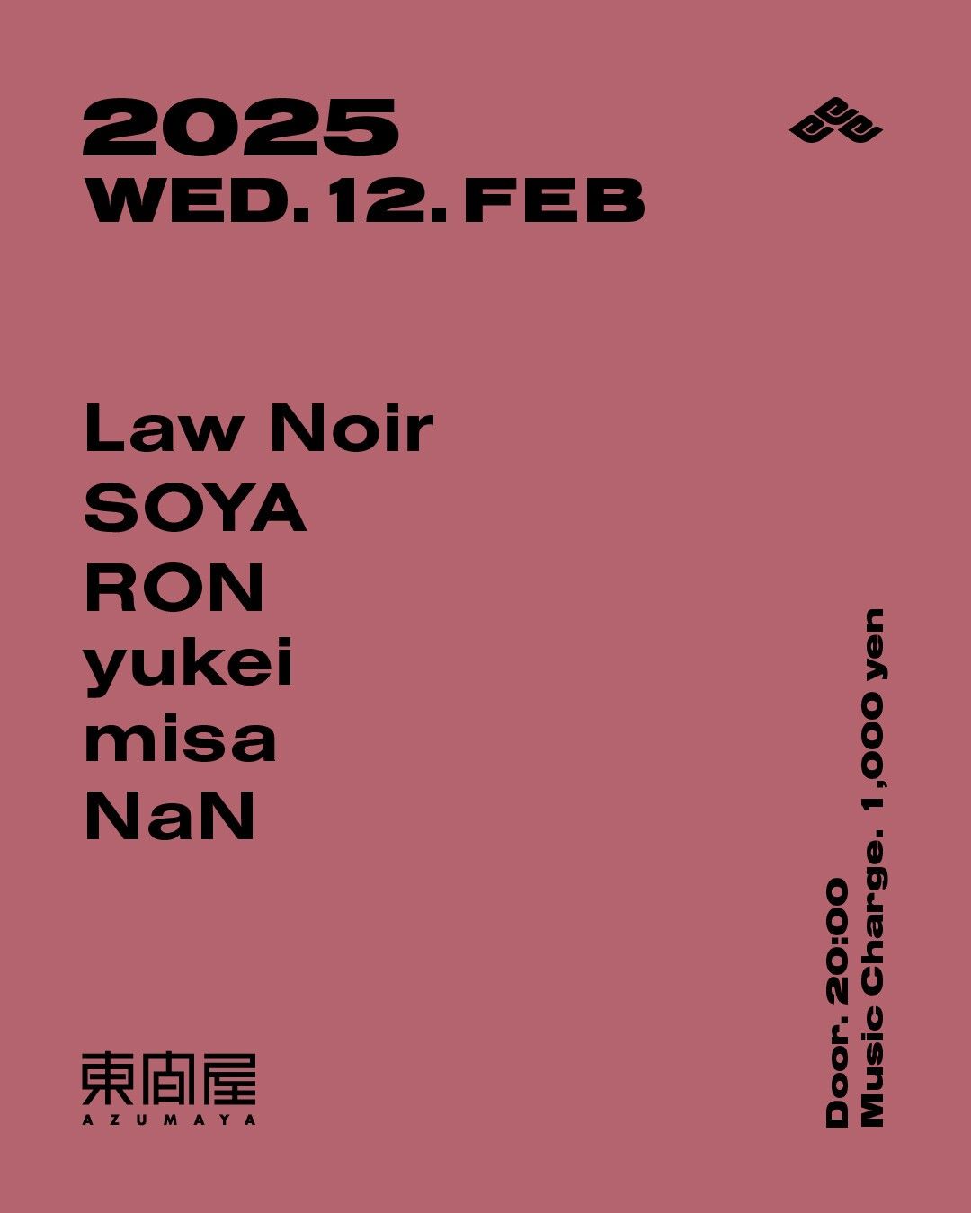 2025.02 12 FEB Azumaya -Wednesday- HOUSE TECHNO 0 Shares Facebook Twitter google Line DATE: 2025-02-12 WED OPEN: 20:00 VENUE: PRICE: Music Charge 1,000yen LINE UP: Law Noir SOYA RON yukei misa NaN