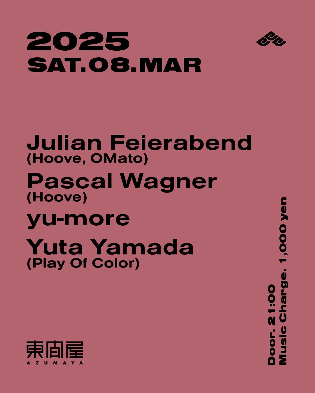 2025.03 08 MAR Azumaya -Saturday- DEEP HOUSE TECH HOUSE 0 Shares Facebook Twitter google Line DATE: 2025-03-08 SAT OPEN: 21:00 VENUE: PRICE: Music Charge 1,000yen LINE UP: Julian Feierabend (Hoove, OMato) Pascal Wagner (Hoove) yu-more Yuta Yamada (Play Of Color)