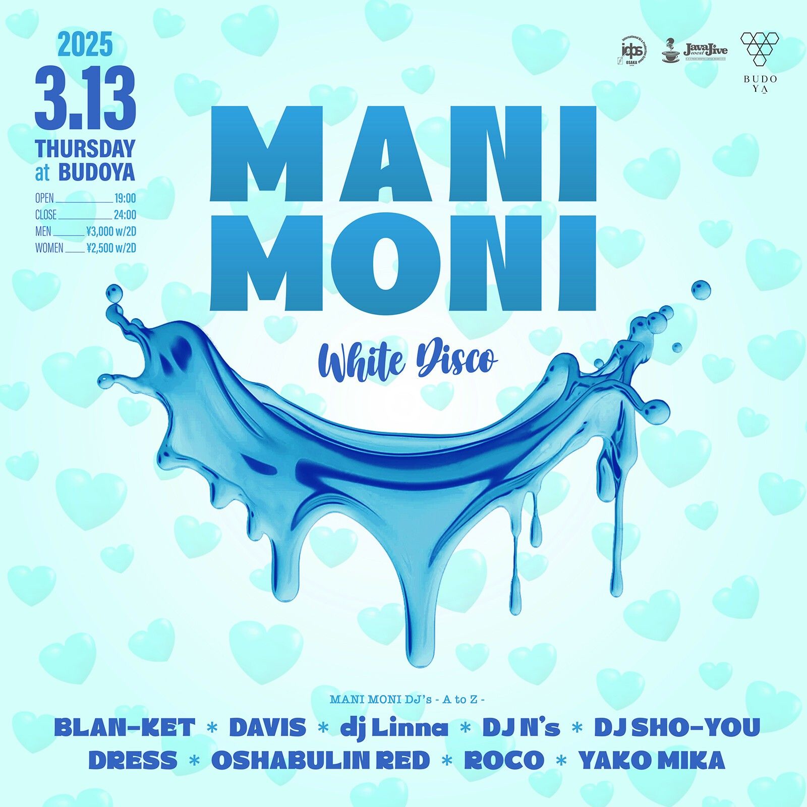 3月13日の木曜日は、梅田 BUDOYA OSAKA で毎月第二木曜日にレギュラー開催中のディスコパーティ MANI MONI のホワイトデー企画、White Disco が夜19時から深夜0時までのデイイベント公演で開催!