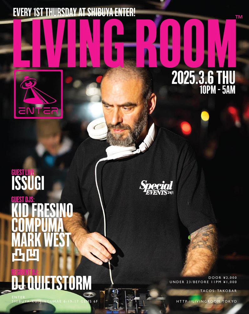 ヒップホップ/ハウス/ジャズに限らず、様々な手法で独自の音楽を提示し続けた真の音楽家であるDJ QUIETSTORM。彼だからこそ為し得ることのできる特別な一夜にはこれまで、平日のパーティにも関わらず様々なジャンルのトップDJ/アーティストだけでなく、これからの音楽を担う若いアーティストを招き、音楽を愛する多くの人々を魅了してきた。 代官山UNICE→渋谷contactを経て、渋谷ENTERではソファーに座ってのDJスタイルではないがダンスフロアー中央にブースが位置する新しいスタイルがLIVING ROOM™のコンセプトにマッチし毎回素敵な空間となっている。