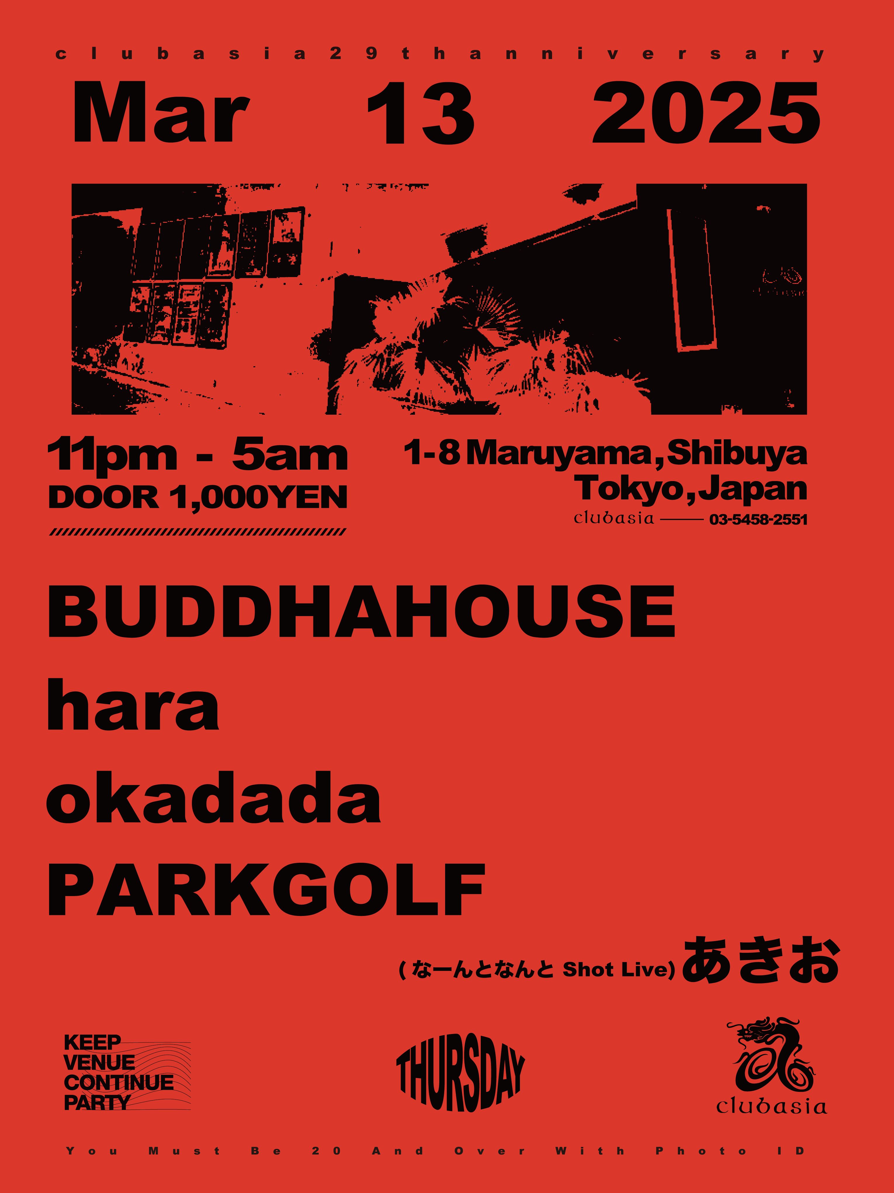 2025.03 13 MAR clubasia THURSDAY HOUSE 0 Shares Facebook Twitter google Line DATE: 2025-03-13 THU OPEN: 23:00 VENUE: PRICE: ¥1,000- LINE UP: BUDDHAHOUSE hara okadada PARKGOLF あきお(なーんとなんとshot live) ✸ BUDDHAHOUSE, haraが贈る第2木曜clubasia "THU"。 #clubasia29th monthは第一木曜を担うokadadaに、 お馴染みPARKGOLFをゲストに招く。 更にはあきおがShot Liveで参戦!