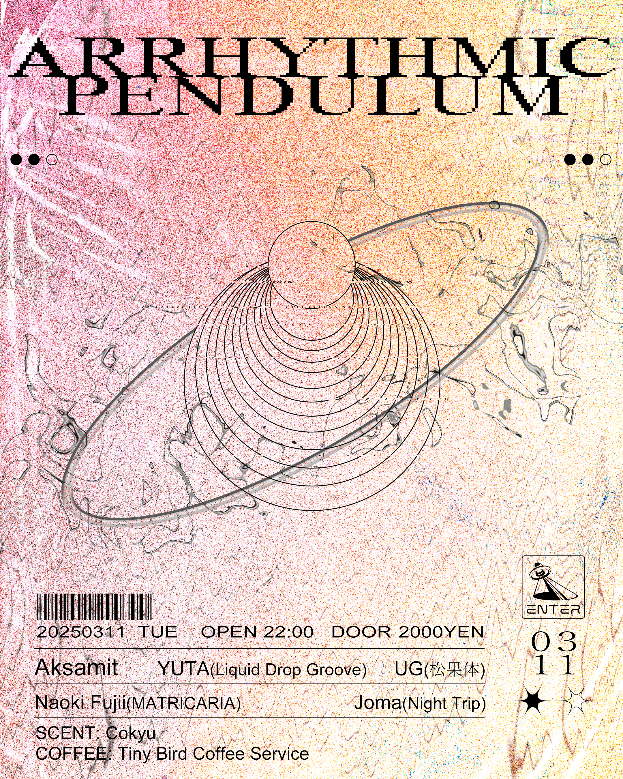 数多のヴェニューで開催されている重要パーティを仕掛けるレーベル兼プロダクション〈Liquid Drop Groove〉のYUTAと、ディープテクノパーティ松果体の主導者UGによるPendulum。本パーティはダンスミュージックにフォーカスしたラインナップで週末開催してきたが、今回は平日火曜日に、アンビエント、ダウンテンポ、ダブテクノにフォーカスしたラインナップで、Arrhythmic Pendulumと銘打ち、趣異なるパーティを開催。