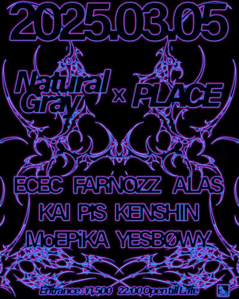 様々なヴェニューで活動しているプロデューサーやDJを招くnatural gray。 オーストラリアからFarnozz率いるPLACEとのコラボを実現し、更にALASを迎え平日ながらもボリュームたっぷりのラインナップでお届けします。