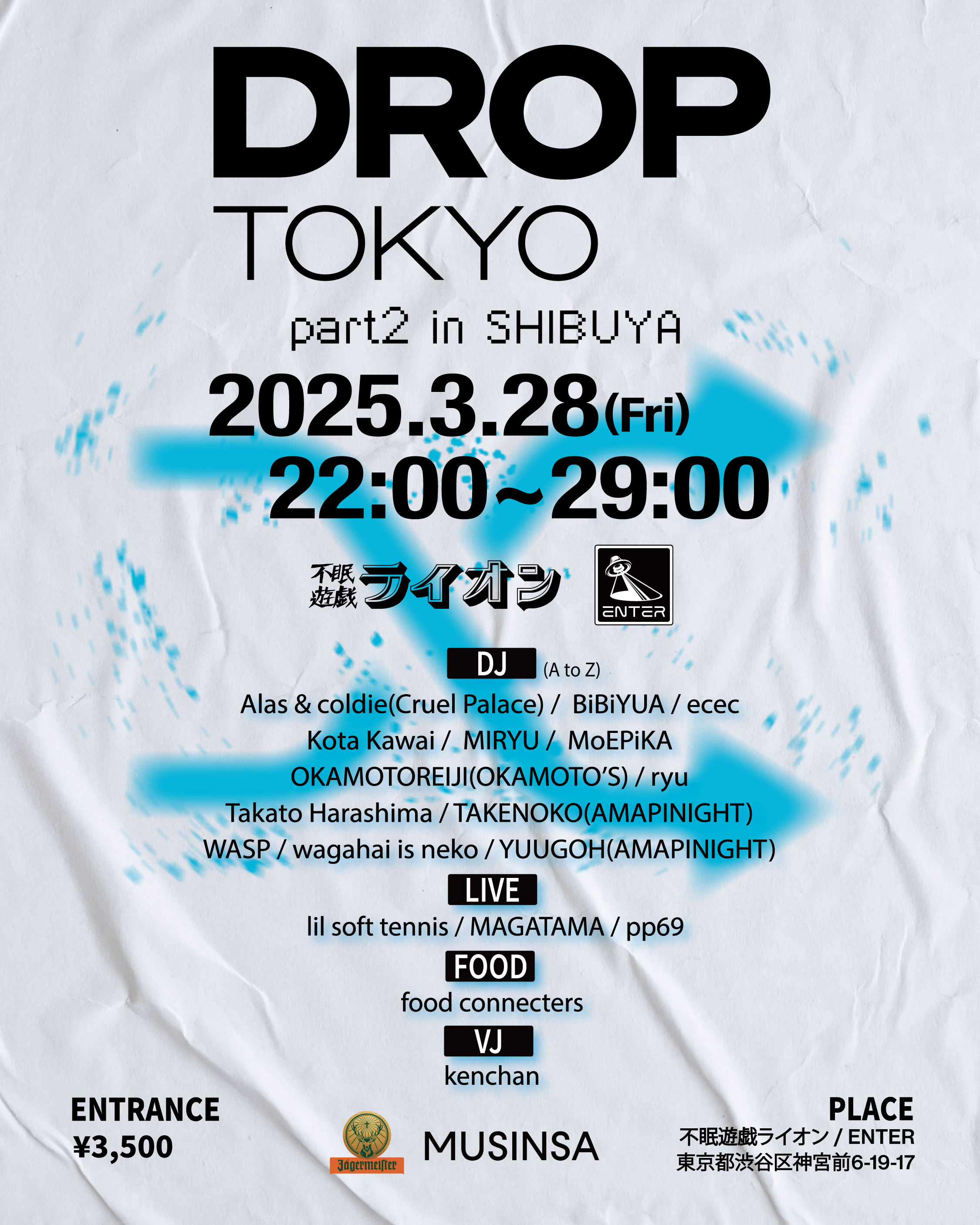 15年以上、東京を拠点にストリートを記録し続けてきたDroptokyoが主催する、エクスクルーシヴな大型イベントDrop Shuffle。第2弾は3月28日(金)の22:00から29:00まで、渋谷の不眠遊戯ライオンと ENTER の2フロアにて開催。今回は、東京ストリートを牽引するコミュニティが勢揃いしたスペシャルなオールナイト音楽イベント!