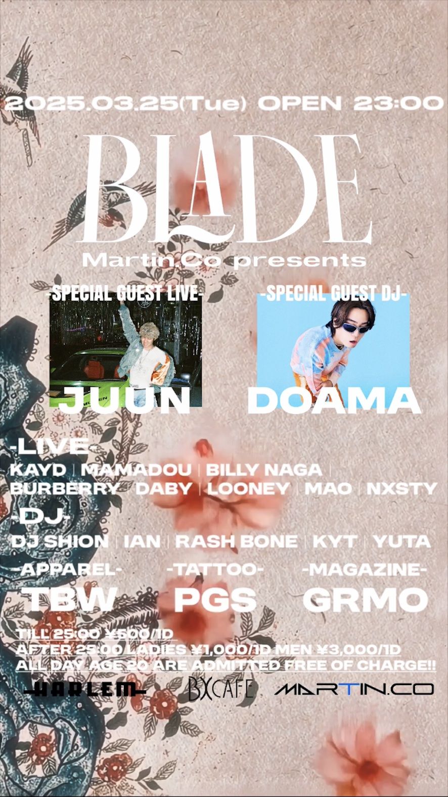 - LADIES ¥1,000/1d MEN ¥3,000/1d ※ TILL 25:00 ¥500/1d ※ AGE 20 ARE ADMITTED FREE OF CHARGE ALL DAY!!