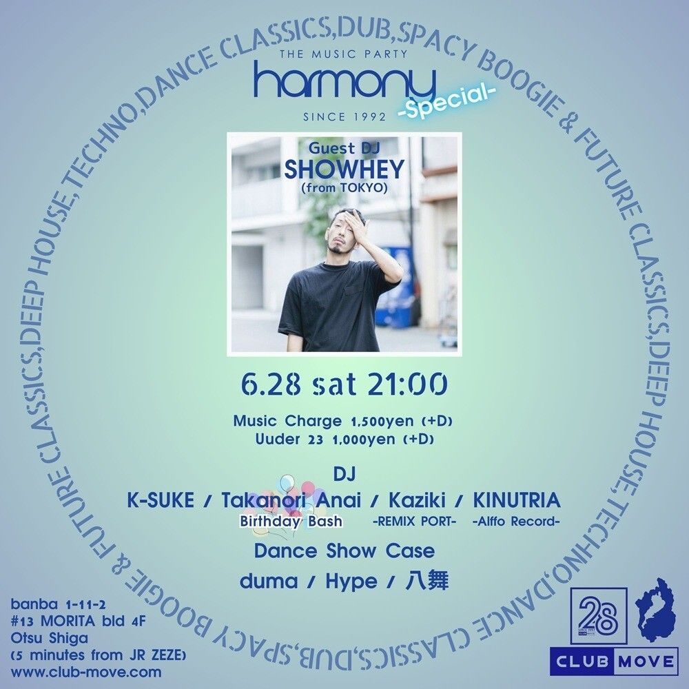 In June, Mr. "SHOWHEY," who is well-known at "TUNNEL" in Aoyama, Tokyo and "DJ BAR Bridge" in Shinjuku, will make his first appearance at MOVE. On this day, which is also the birthday party for regular member "Takanori Anai," we will have Mr. "KINUTRIA," a vinyl DJ from Osaka's Alffo Record staff, as well as Mr. "Kaziki," the organizer of "REMIX PORT," which is celebrating its third anniversary with the theme of "feature," along with a dance showcase by duma, Hype, and hachimai, adding glamour to the floor. In these times of significant changes in the music environment, we hope to continue being this warm place called HARMONY that never changes. By blending the old and the new and crossing various genres, we hope to enjoy an exciting music life with everyone once again. So let's meet at HARMONY in June.