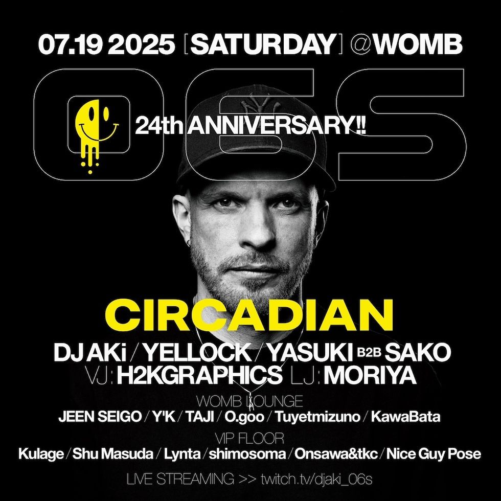 2025.07 19 JUL 06S 24TH ANNIVERSARY DRUM&BASS 0 Shares Facebook Twitter google Line DATE: 2025-07-19 SAT OPEN: 22:30 VENUE: PRICE: DOOR:¥3500 ADVANCE TICKETS: ¥3000 LINE UP: 2F MAIN FLOOR CIRCADIAN DJ AKi, YELLOCK, YASUKI B2B SAKO VJ: H2KGRAPHICS LJ: MORIYA 4F VIP FLOOR KULAGE, SHU MASUDA, LYNTA, SHIMOSOMA, ONSAWA & TKC, NICE GUY POSE 1F WOMB LOUNGE JEEN SEIGO, Y'K, TAJI, O.GOO, TUYETMIZUNO, KAWABATA WOMB 最長レジデントパーティーで、アジア最大級のドラムンベースパーティーとして長い歴史を歩んでいる 06S が24周年記念を迎える。 アニバーサリーを記念して登場するのは、元 THE PROTOTYPE のメンバーとして数々のアンセムを世に送り込んできたプロデューサー CIRCADIAN が満を持して WOMB に降臨。 迎え撃つはお馴染み 06S 東京レジデント DJs。推進力を持って邁進する 06S の記念すべき夜を盛大に盛り上げましょう。