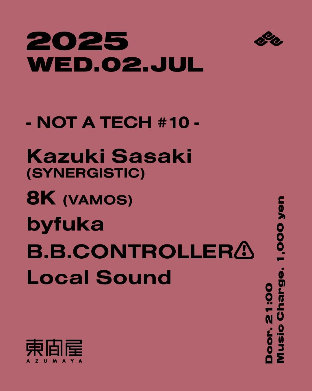 2025.07 02 JUL - NOT A TECH #10 - HOUSE TECHNO 0 Shares Facebook Twitter google Line DATE: 2025-07-02 WED OPEN: 21:00 VENUE: PRICE: Music Charge 1,000yen LINE UP: Kazuki Sasaki (SYNERGISTIC) 8K (VAMOS) byfuka B.B.CONTROLLER⚠︎ Local Sound