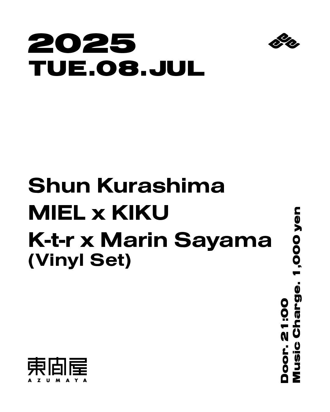 2025.07 08 JUL Azumaya -Tuesday- HOUSE TECHNO 0 Shares Facebook Twitter google Line DATE: 2025-07-08 TUE OPEN: 21:00 VENUE: PRICE: Music Charge 1,000yen LINE UP: Shun Kurashima MIEL x KIKU K-t-r x Marin Sayama (Vinyl Set)