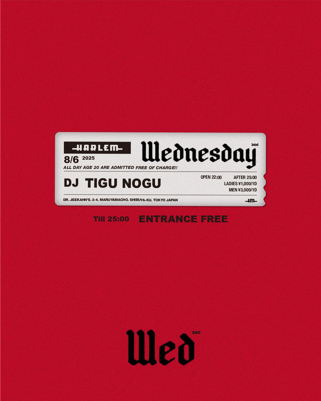 2025.08 06 AUG Wednesday HIPHOP ALLMIX 0 Shares Facebook Twitter google Line DATE: 2025-08-06 WED OPEN: 22:00 VENUE: PRICE: LADIES ¥1,000/1d MEN ¥3,000/1d ※ TILL 25:00 ENTRANCE FREE!! ※ AGE 20 ARE ADMITTED FREE OF CHARGE ALL DAY!! LINE UP: DJ: TIGU, NOGU DJ: TIGU, NOGU