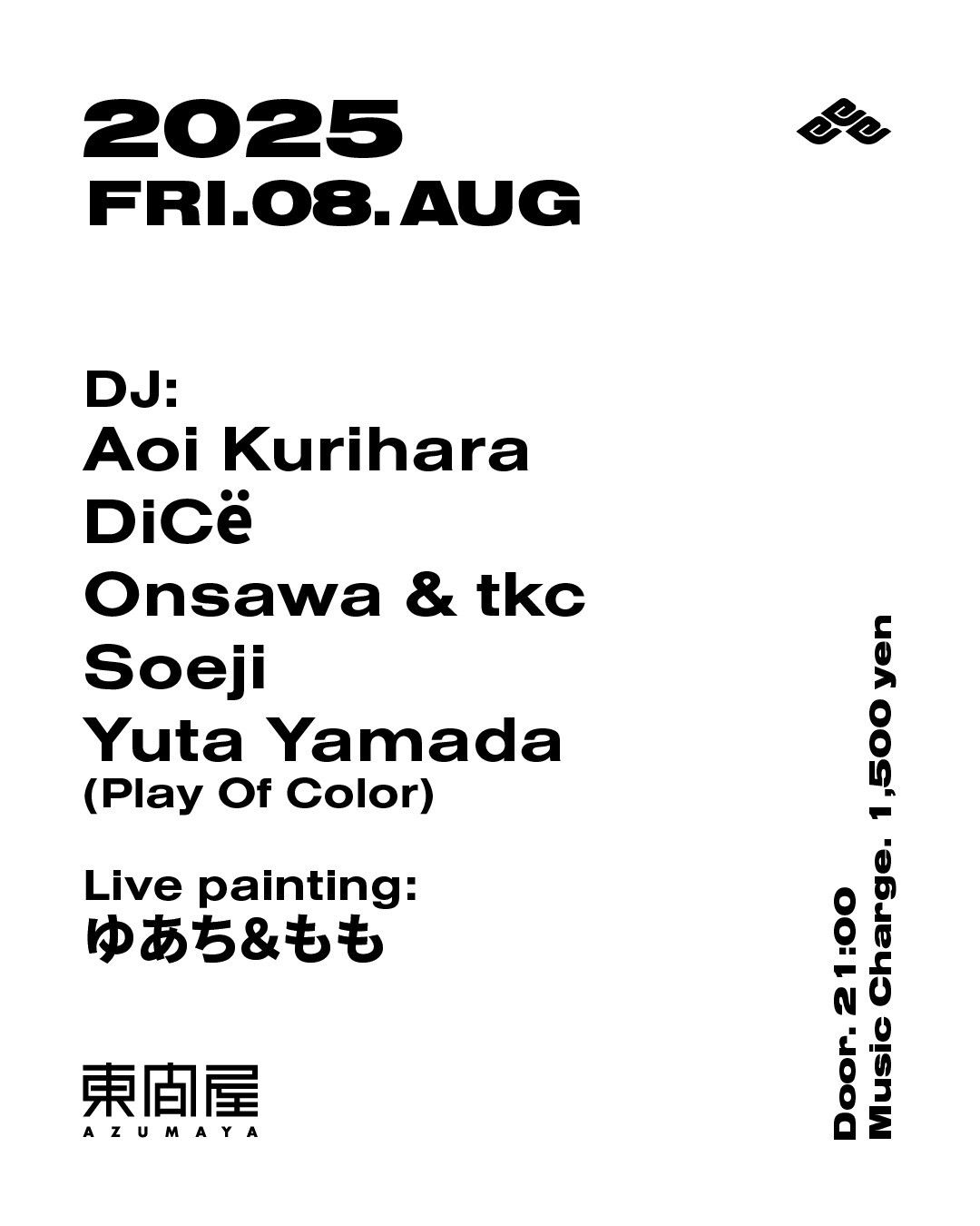 2025.08 08 AUG Azumaya -Friday- HOUSE 0 Shares Facebook Twitter google Line DATE: 2025-08-08 FRI OPEN: 21:00 VENUE: PRICE: Music Charge 1,500yen LINE UP: DJ: Aoi Kurihara DiCё Onsawa & tkc Soeji Yuta Yamada (Play Of Color) Live painting: ゆあち&もも