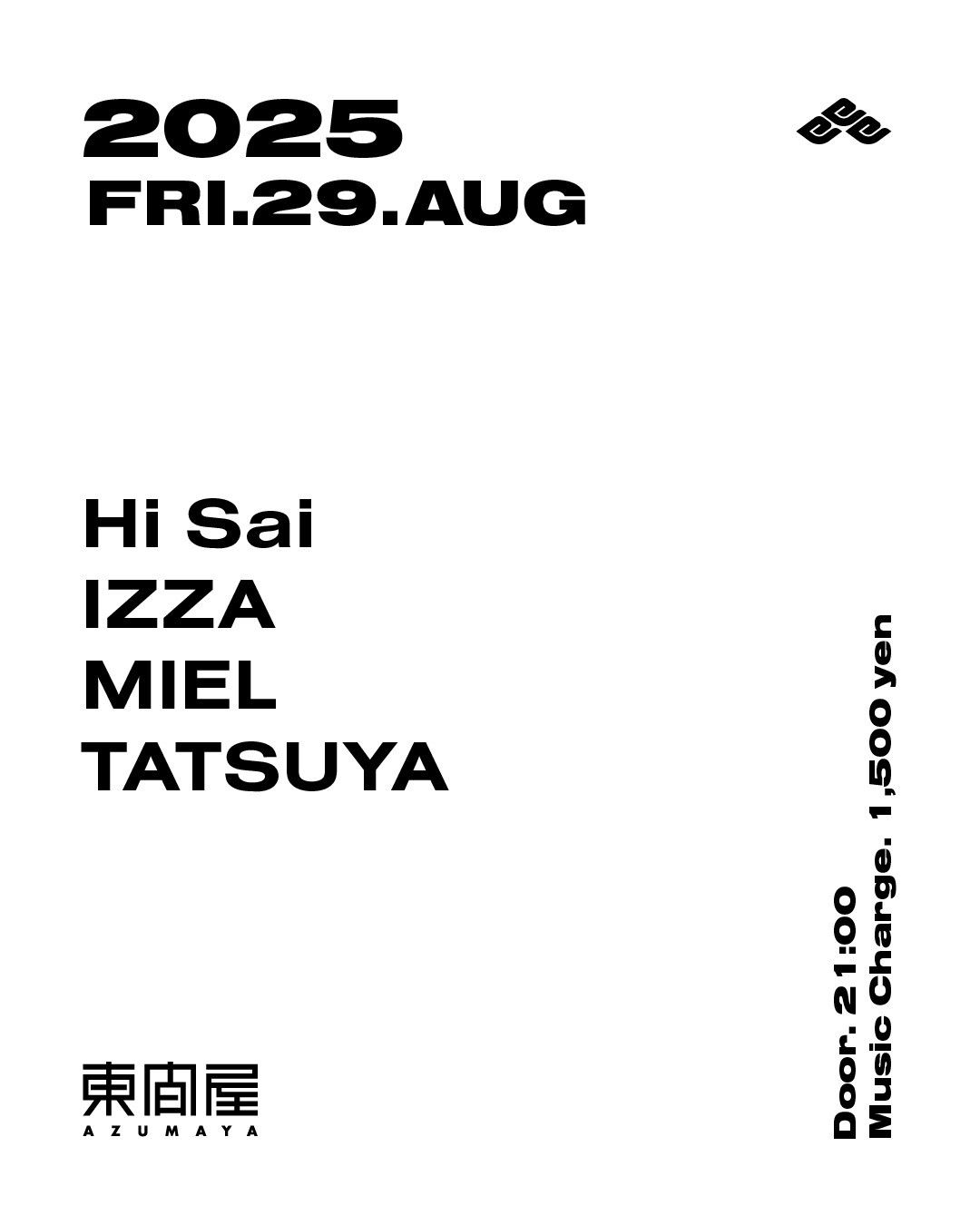 2025.08 29 AUG Azumaya -Friday- HOUSE 0 Shares Facebook Twitter google Line DATE: 2025-08-29 FRI OPEN: 21:00 VENUE: PRICE: Music Charge 1,500yen LINE UP: Hi Sai IZZA MIEL TATSUYA