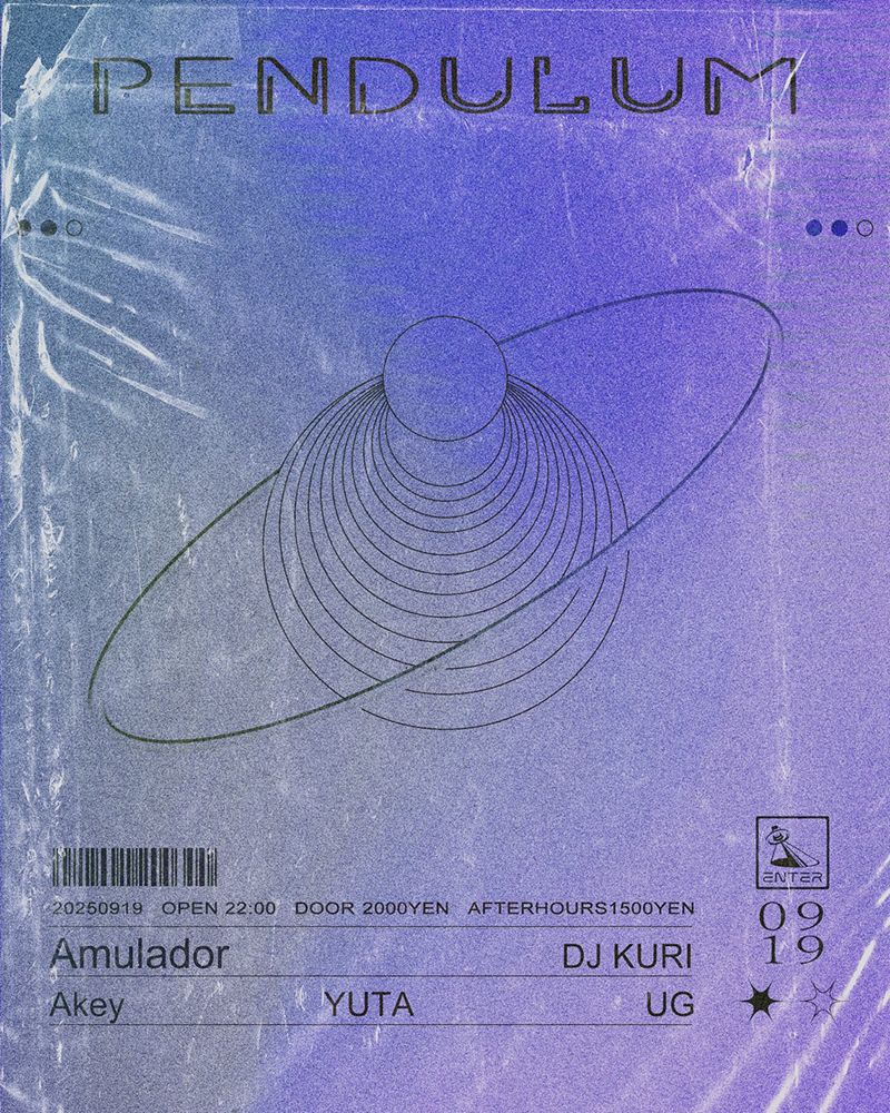 先進気鋭のアプローチとキュレーションで国内最高峰のレーベルとなったサイケデリックテクノのオリジネーター〈Liquid Drop Groove〉主宰のYUTAと、ディープテクノパーティ松果体の主導者UGが、テクノシーンのさらなる拡張を目的に始動したPendulum。5回目となる今回、ポルトガルよりAMULADORを招聘。