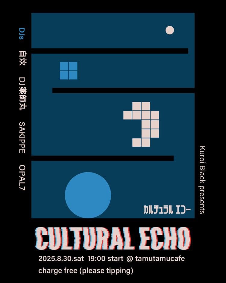 今月末はtamutamucafeでこちら。今回のテーマは、"日本の音楽”ということでecho noirは一旦お休みしてCultural Echoを開催します。慈愛のホストDJコンビ慈母子より自炊、Japanese musicのディープな歌も追求しつつキャッチーなセンスのセレクトに注目のDJ薬師丸、最近活動を再開したSAKIPPE、そしてOPAL7による四者四様の日本の音楽セレクトをお楽しみください。