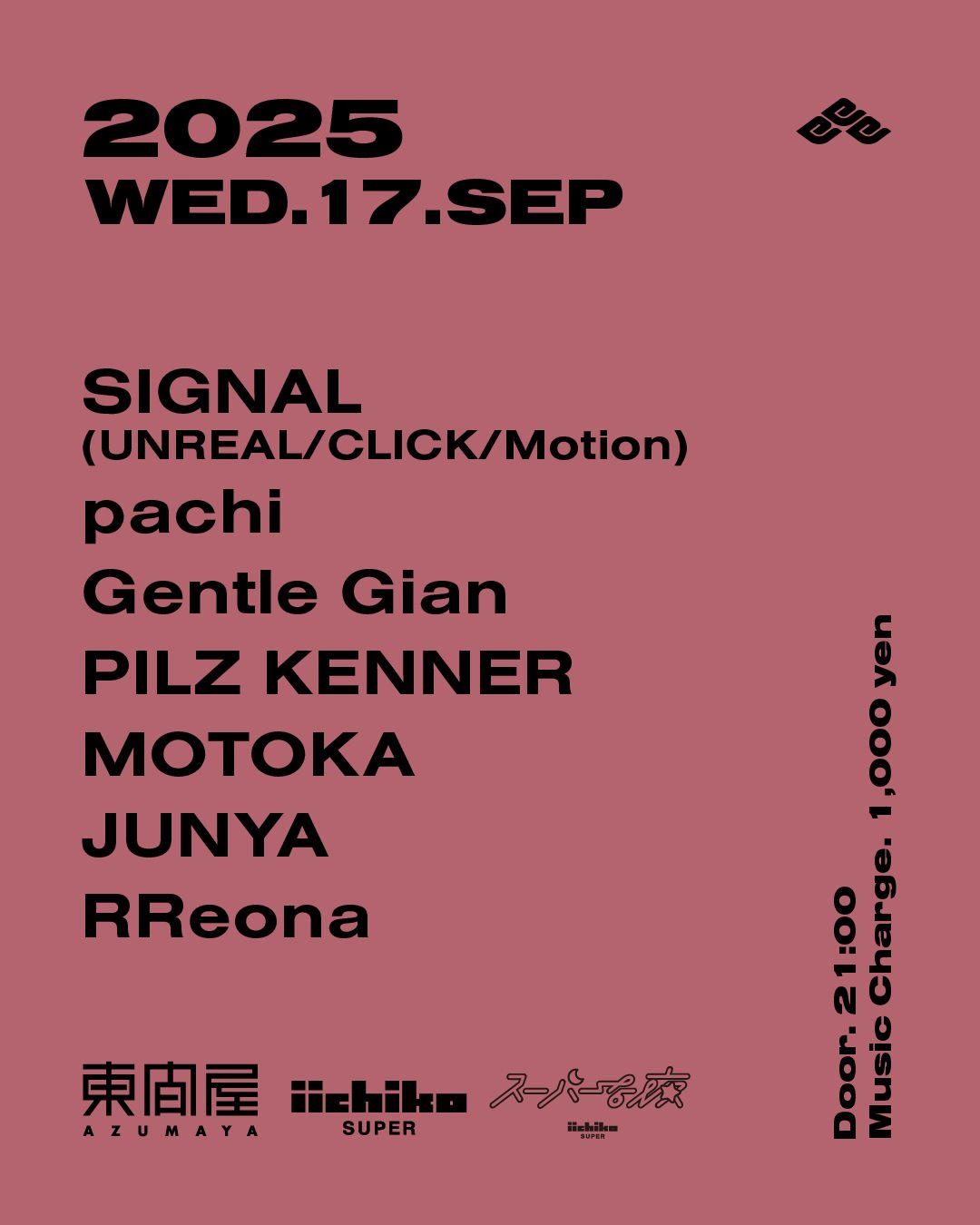 2025.09 17 SEP Azumaya -Wednesday- HOUSE TECHNO 0 Shares Facebook Twitter google Line DATE: 2025-09-17 WED OPEN: 21:00 VENUE: PRICE: Music Charge 1,000yen LINE UP: SIGNAL (UNREAL/CLICK/Motion) pachi Gentle Gian PILZ KENNER MOTOKA JUNYA RReona