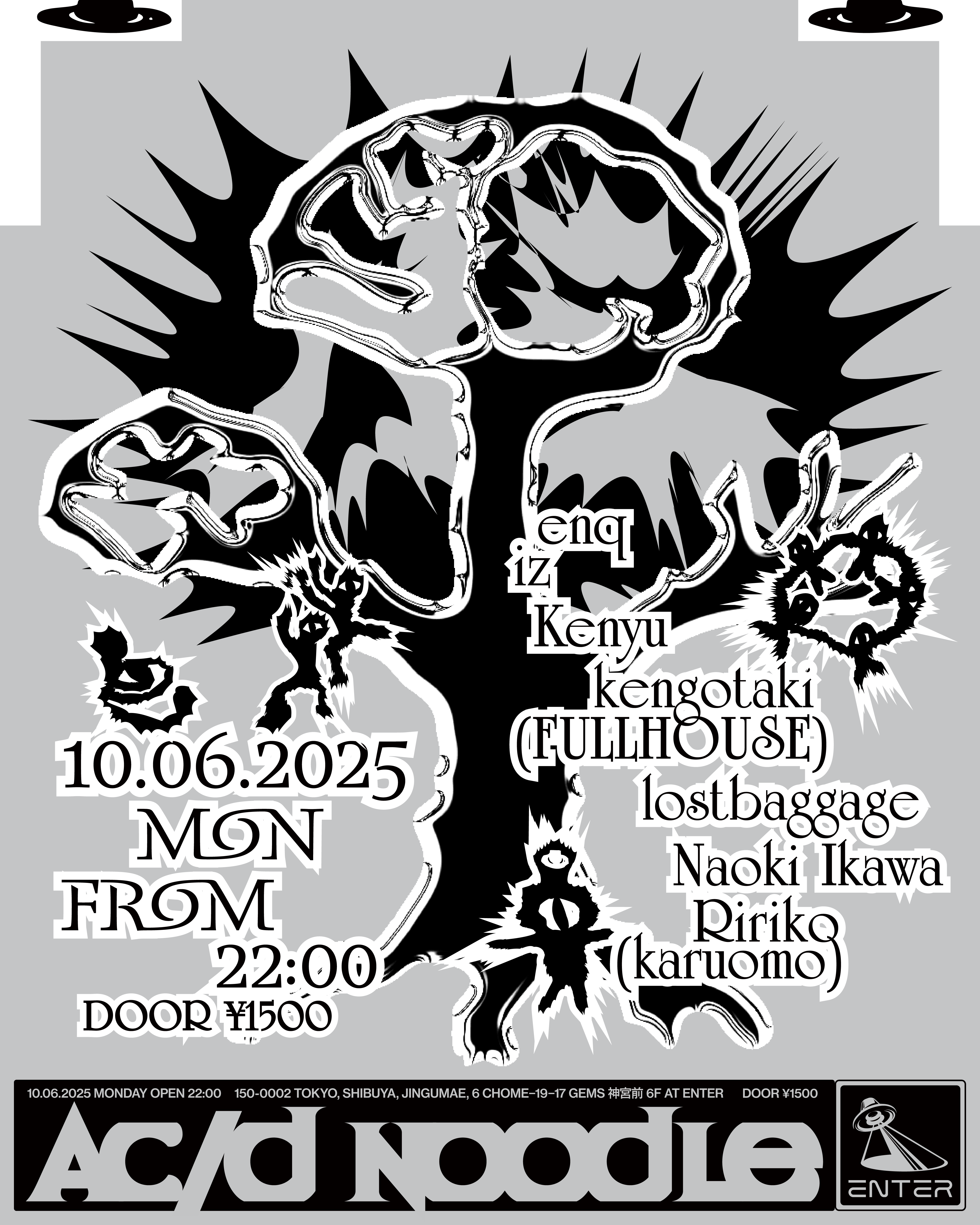 AC/D NOODLEは、テクノ、ハウス、ミニマルなど多彩な音楽を交差させ、フロアに独自の空間を生み出す。与えられる音の刺激に身を委ね、心のままに自由に感じることができる場。