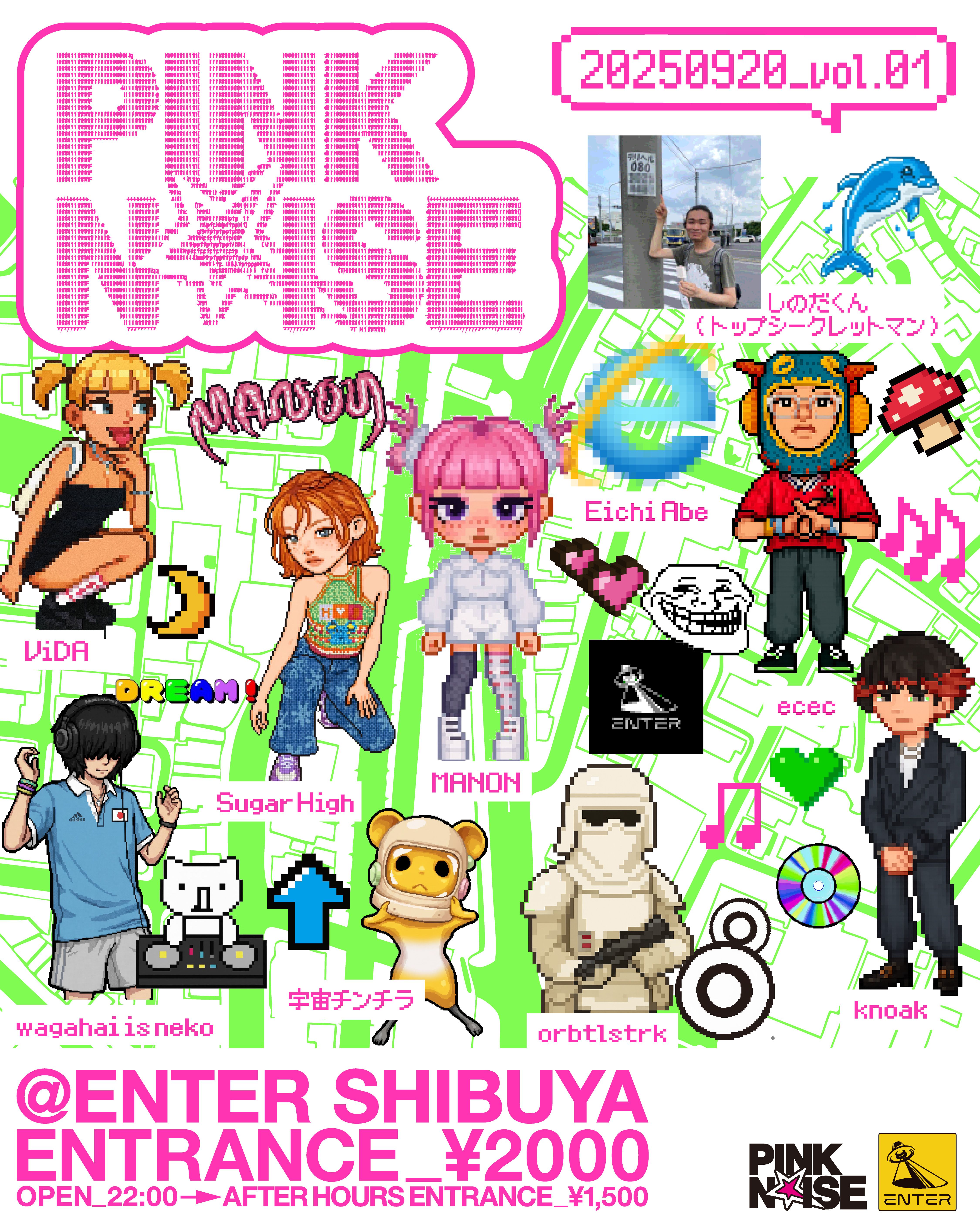 MANONが主催する新パーティプロジェクト PINK NOISE が9月20日 (金) ENTER SHIBUYAにて始動。次世代のカルチャーを体感できるこの夜には、MANON自身の交友関係から気鋭のアーティストや彼女が注目する才能が集結し、フロアを熱狂で満たします。音楽・ファッション・アートが交錯する空間で、響き合う次世代のノイズの渦に身を委ねてみてほしい。
