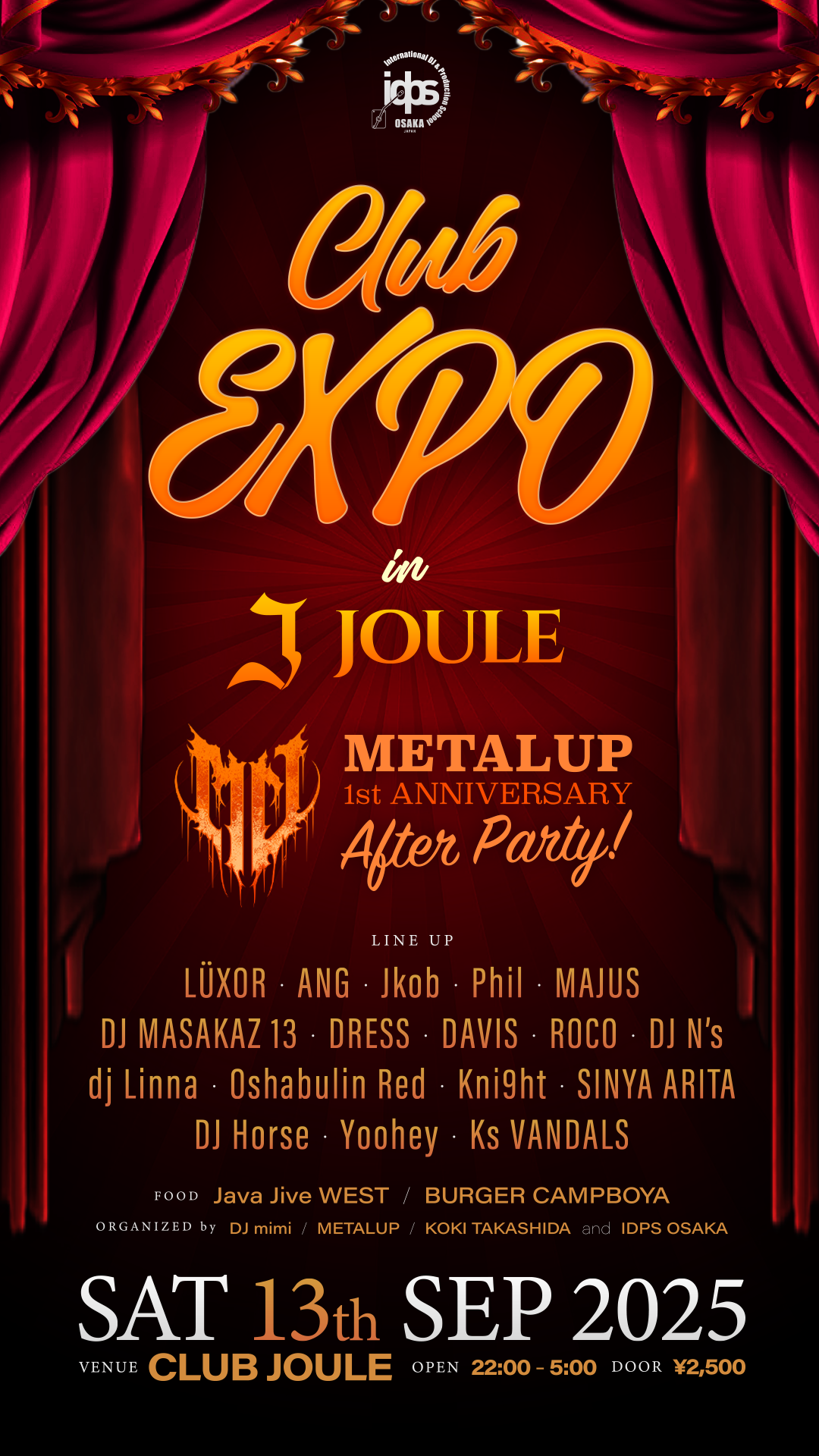 毎週金曜日に IDPS OSAKA でレギュラー開催中の Club EXPO が、9月13日土曜日にアメリカ村 Club Joule に会場を移して開催が決定!関西万博スタッフ達による本パーティに加え、この度、開催1周年を迎えるメタルミュージック・パーティ METALUP のアフターパーティも同時開催し、フードには Java Jive WEST、BUGER CAMPBOYA が出店。テクノからメタルミュージックまで3フロア構成でオールナイト公演をお楽しみ頂けます。