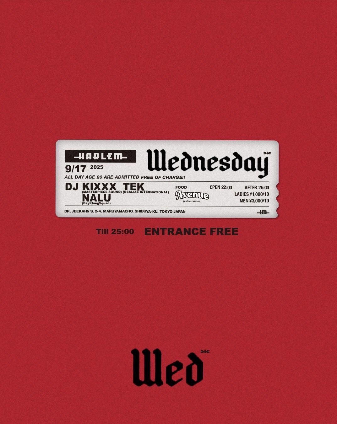 - LADIES ¥1,000/1d MEN ¥3,000/1d ※ TILL 25:00 ENTRANCE FREE!! ※ AGE 20 ARE ADMITTED FREE OF CHARGE ALL DAY!!