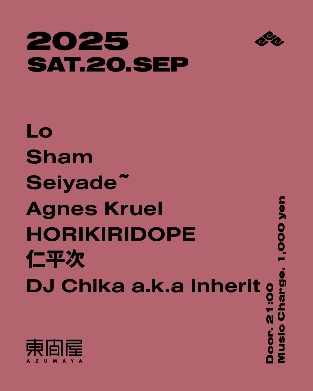 2025.09 20 SEP Azumaya -Saturday- HIPHOP 0 Shares Facebook Twitter google Line DATE: 2025-09-20 SAT OPEN: 21:00 VENUE: PRICE: Music Charge 1,000yen LINE UP: Lo Sham Seiyade~ Agnes Kruel HORIKIRIDOPE 仁平次 DJ Chika a.k.a Inherit