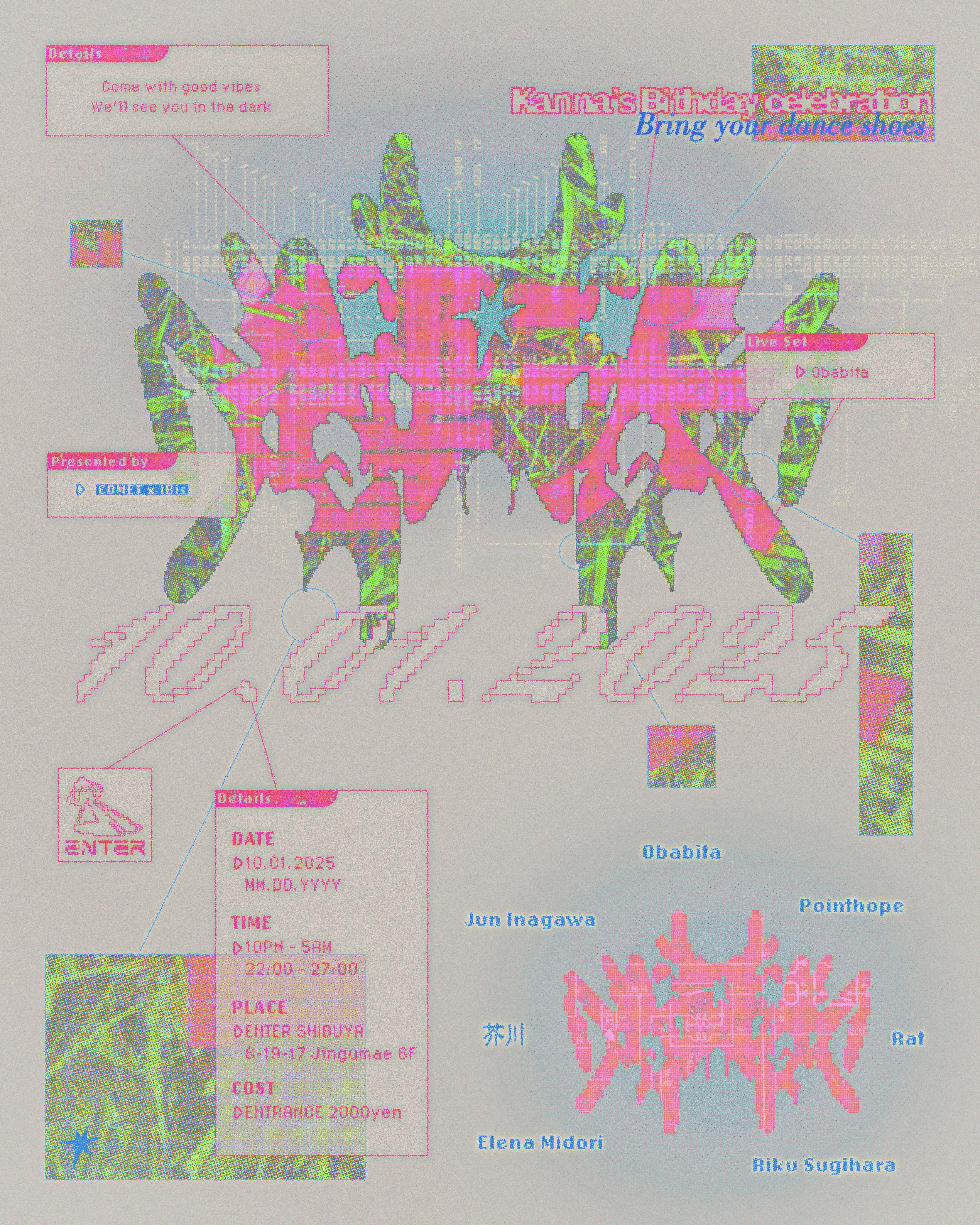 超ヒーローロックスターJun Inagawa、Frog 3のマスターブレインの役割を果たすトラックメイカーObabita、4月に行われた成田某所のレイヴにおいて彗星の如く現れたTopiaの超新星Pointhope、FindingsのキュレーターでもあるネオガールのElena Midori、リズミカルな音からパンチの効い音まで縦横無尽に駆け巡るRat、 DENKAIからやってきたトライバル忍者芥川、初登場のRiku Sugihara。