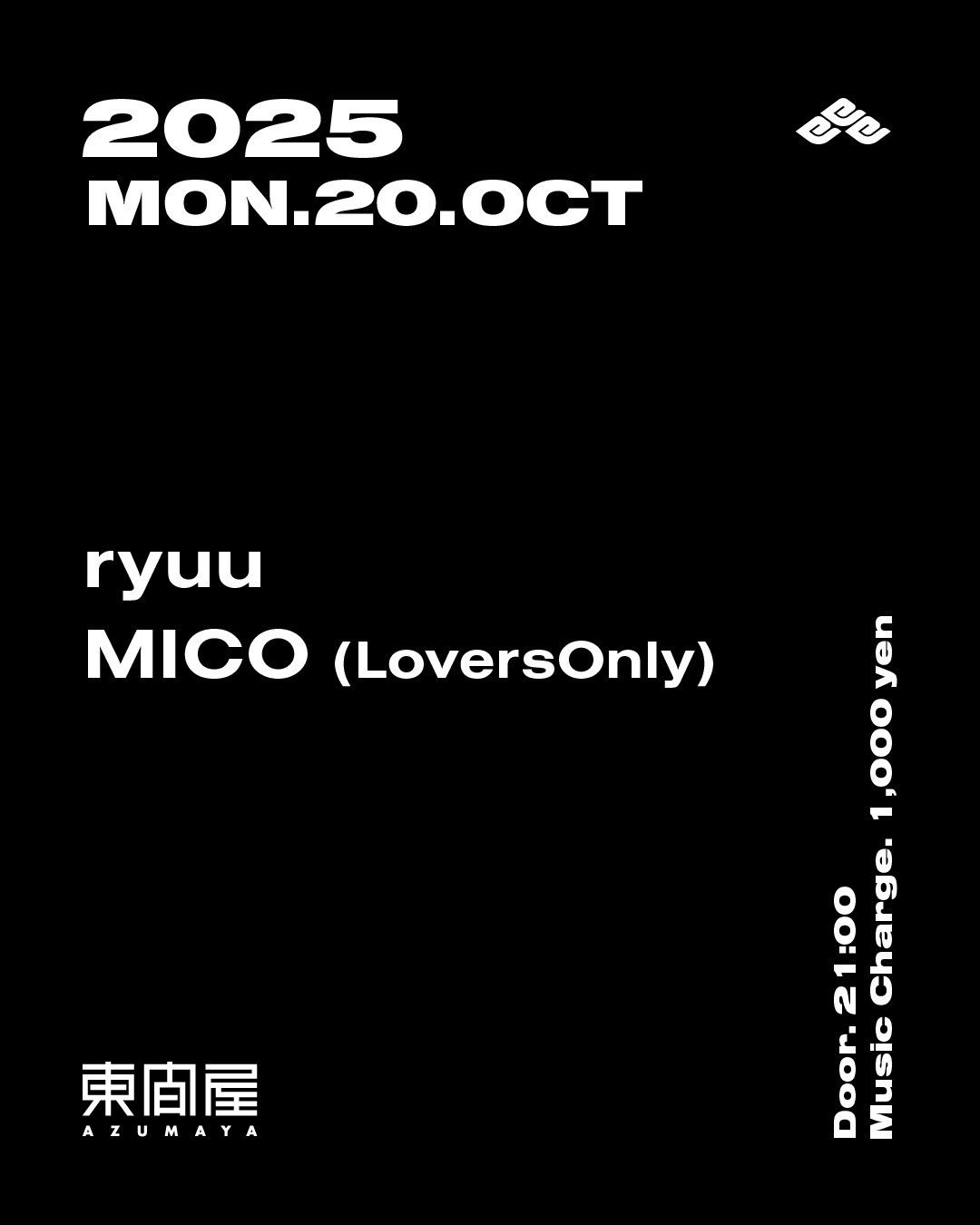 2025.10 20 OCT Azumaya -Monday- ALLMIX 0 Shares Facebook Twitter google Line DATE: 2025-10-20 MON OPEN: 21:00 VENUE: PRICE: Music Charge 1,000yen LINE UP: ryuu MICO (LoversOnly)