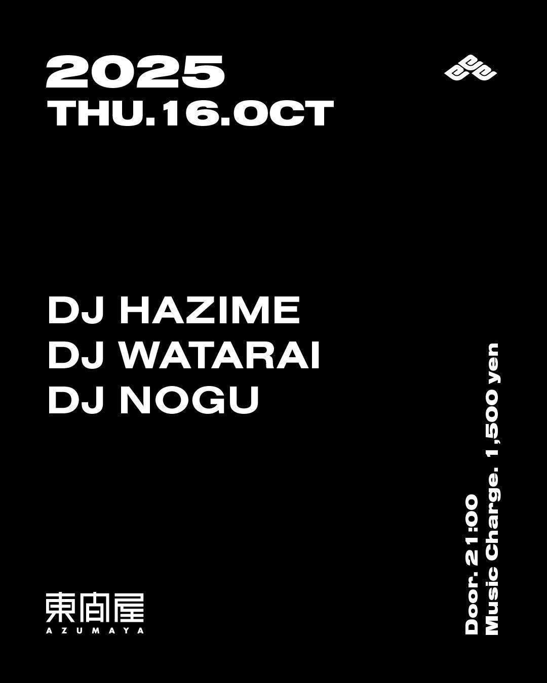 2025.10 16 OCT Azumaya -Thurssday- HIPHOP 0 Shares Facebook Twitter google Line DATE: 2025-10-16 THU OPEN: 21:00 VENUE: PRICE: Music Charge 1,500yen LINE UP: DJ HAZIME DJ WATARAI DJ NOGU