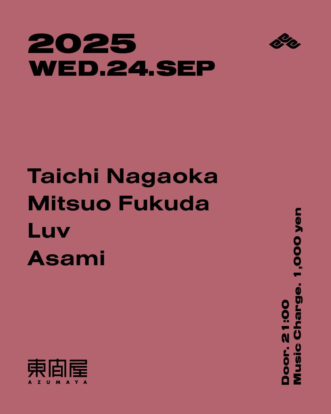 2025.09 24 SEP Azumaya -Wednesday- HOUSE TECHNO 0 Shares Facebook Twitter google Line DATE: 2025-09-24 WED OPEN: 21:00 VENUE: PRICE: Music Charge 1,000yen LINE UP: Taichi Nagaoka Mitsuo Fukuda Luv Asami