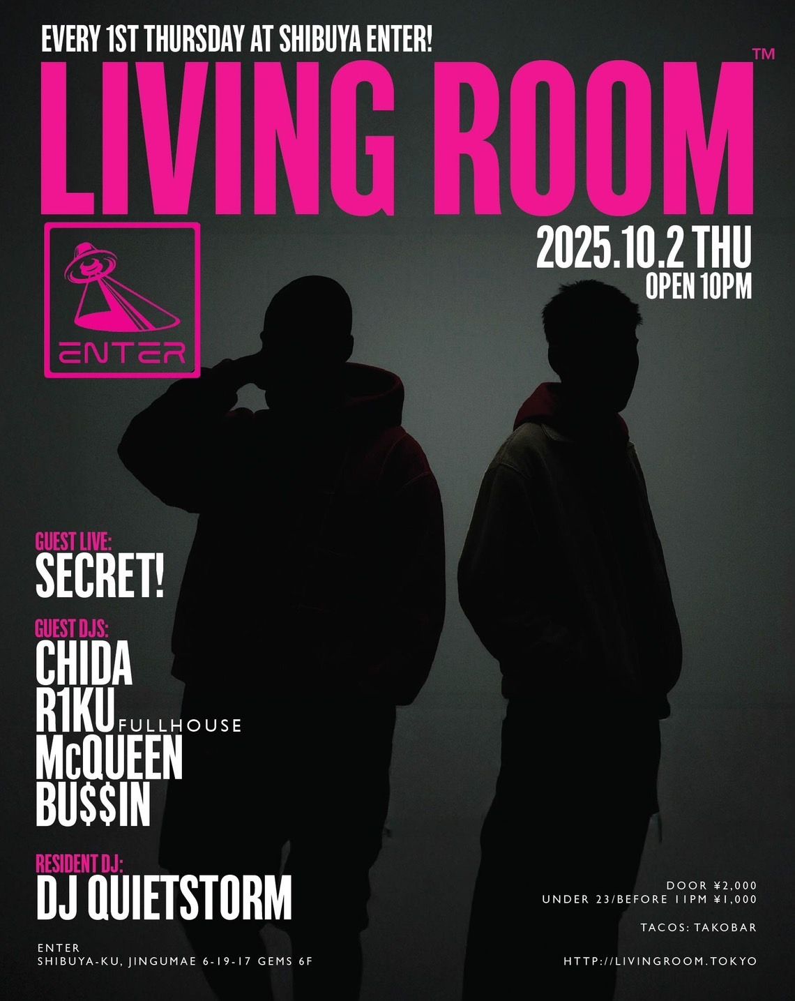 ヒップホップ/ハウス/ジャズに限らず、様々な手法で独自の音楽を提示し続けた真の音楽家であるDJ QUIETSTORM。彼だからこそ為し得ることのできる特別な一夜にはこれまで、平日のパーティにも関わらず様々なジャンルのトップDJ/アーティストだけでなく、これからの音楽を担う若いアーティストを招き、音楽を愛する多くの人々を魅了してきた。 代官山UNICE→渋谷contactを経て、渋谷ENTERではソファーに座ってのDJスタイルではないがダンスフロアー中央にブースが位置する新しいスタイルがLIVING ROOM™のコンセプトにマッチし毎回素敵な空間となっている。