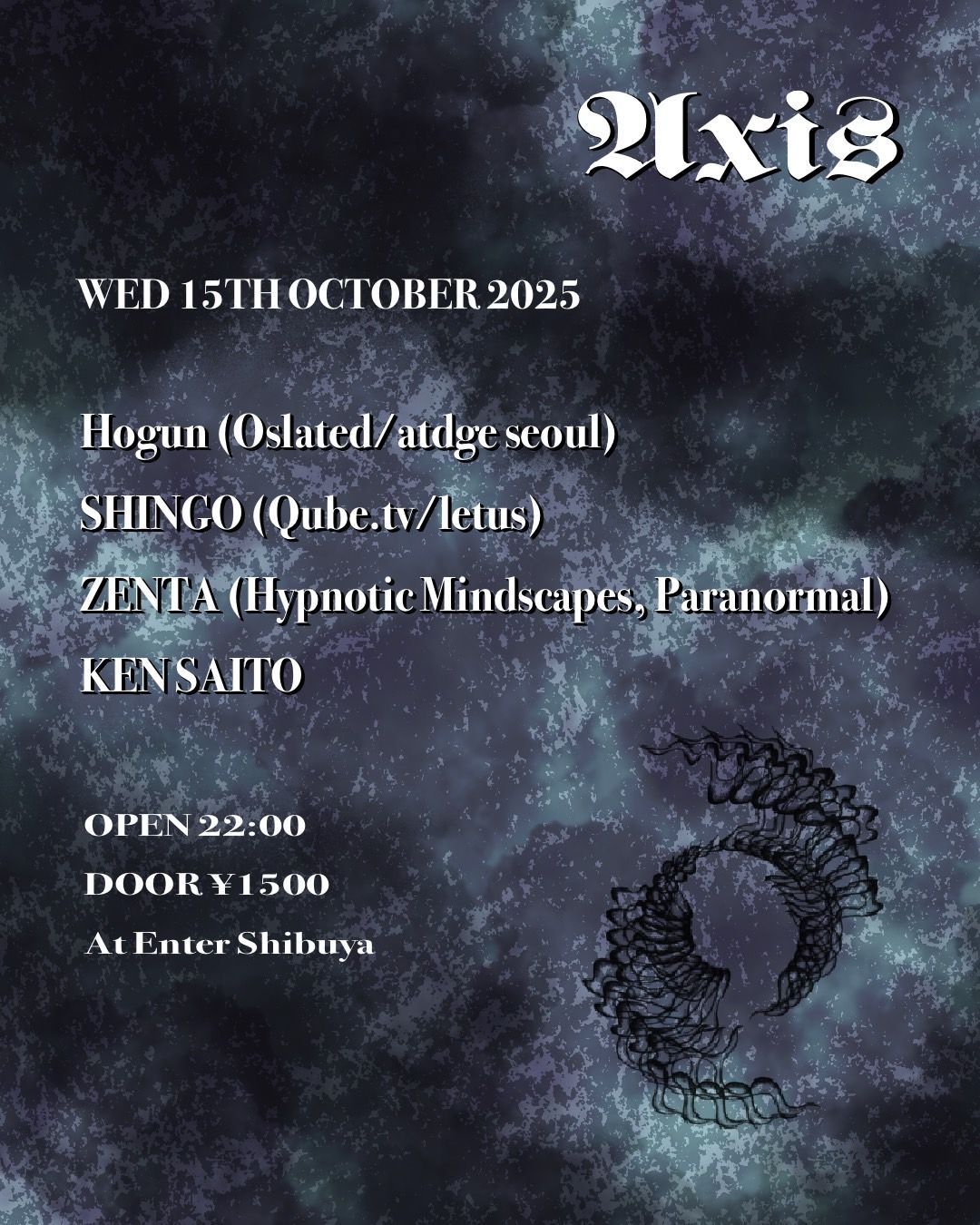 KEN SAITOが仕掛けるAxis。2022年からDJ活動を開始しEnterスタッフ、北千住のレコードショップletus recycle centerで現場経験を積む彼は、インプットとアウトプットを相互に繰り返し、多様な哲学を持つ人々が集まる東京で、徐々に頭角を表している。今回はエレクトロニックミュージックレーベル〈Oslated〉のメンバーでありDJバーAtdgeを運営するソウルの要人Hogunを筆頭に、大阪よりQUBE tv、野外パーティLetusでの活動で名を馳せるSHINGO、レーベル兼プロモーター〈Hypnotic Mindscapes〉主宰のZENTAを招き入れる。