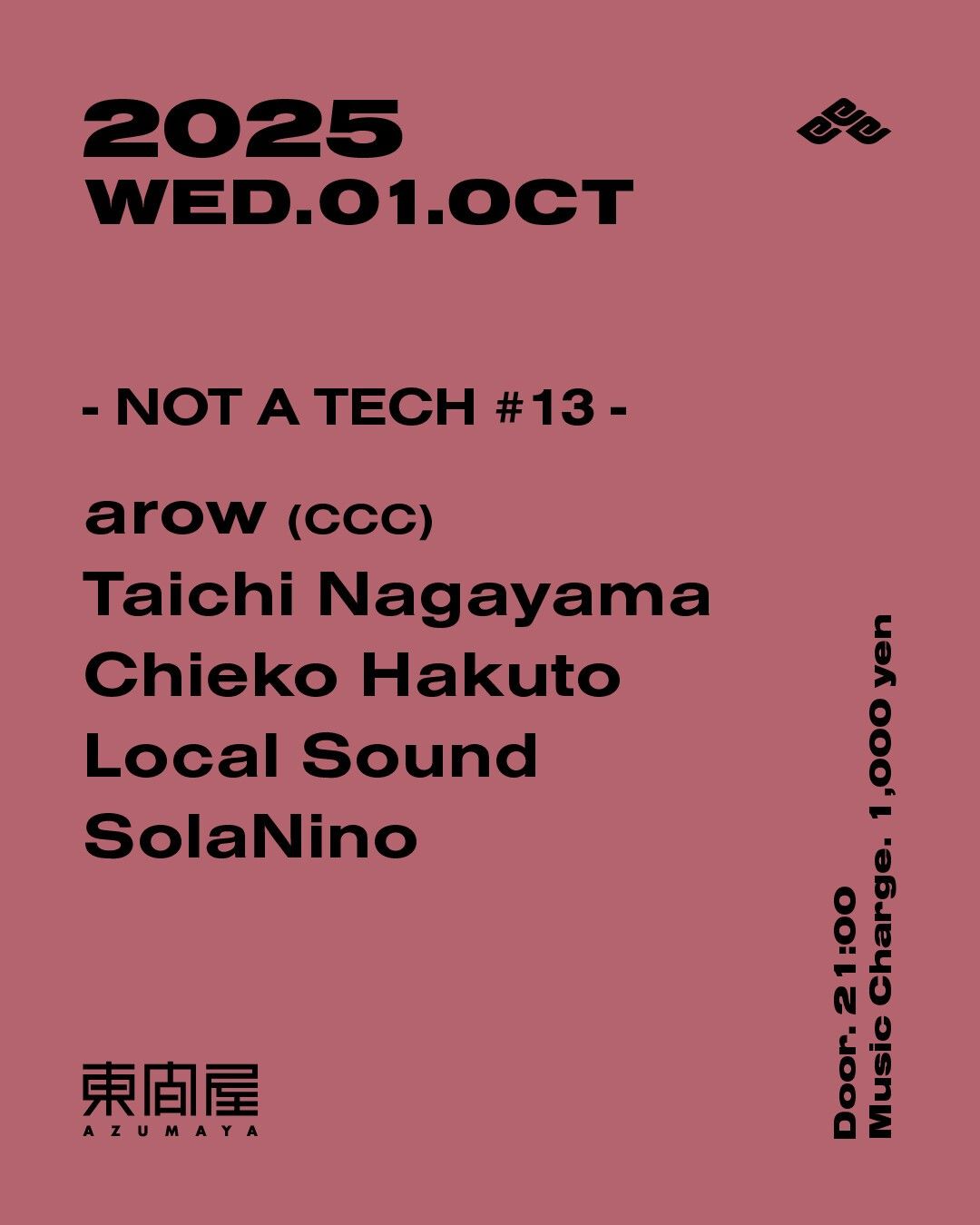 2025.10 01 OCT - NOT A TECH #13 - HOUSE TECHNO 0 Shares Facebook Twitter google Line DATE: 2025-10-01 WED OPEN: 21:00 VENUE: PRICE: Music Charge 1,000yen LINE UP: arow (CCC) Taichi Nagayama Chieko Hakuto Local Sound SolaNino