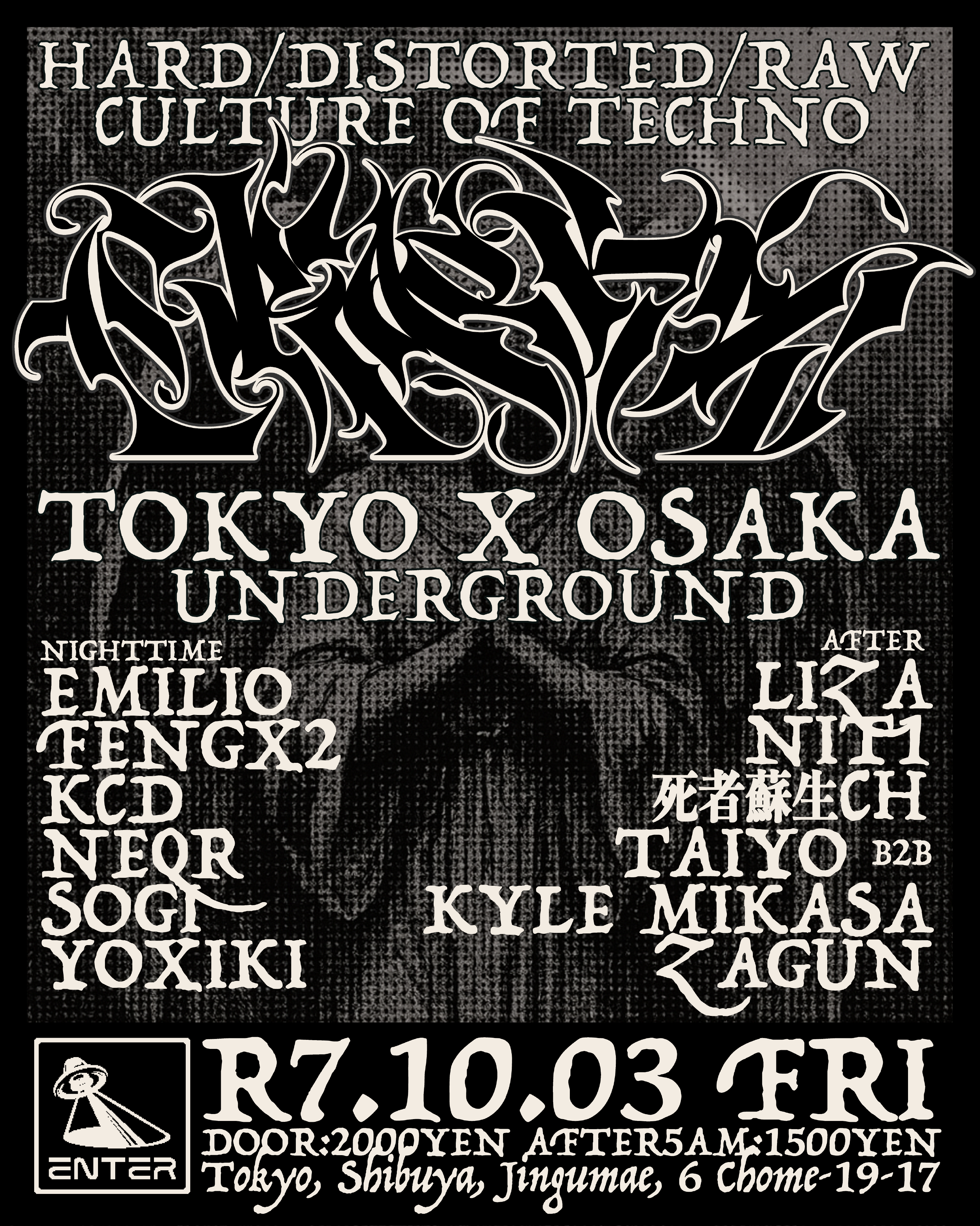 東京渋谷の先端的なカルチャーを発信する拠点 ENTER SHIBUYA にて、東京と大阪、それぞれの都市のアンダーグラウンドテクノカルチャーを拡張させ続けるDJが集結し、イベント CRACKS が開催。