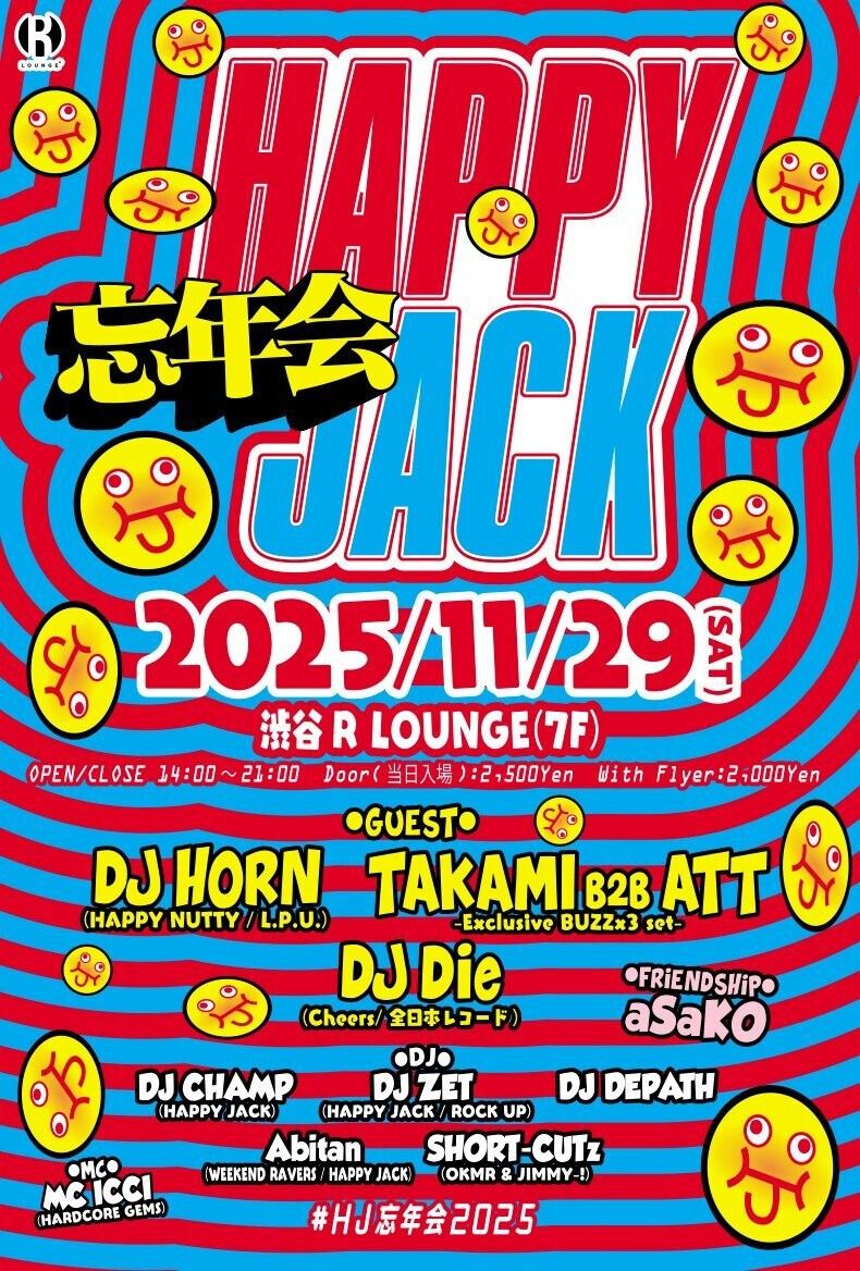 渋谷R LOUNGEで開催されるハードコアをメインとする享楽的ダンスミュージックの祭典HAPPY JACK。2025年最後の開催となる11月29日のHAPPY JACKは、毎年恒例「忘年会」として挙行!