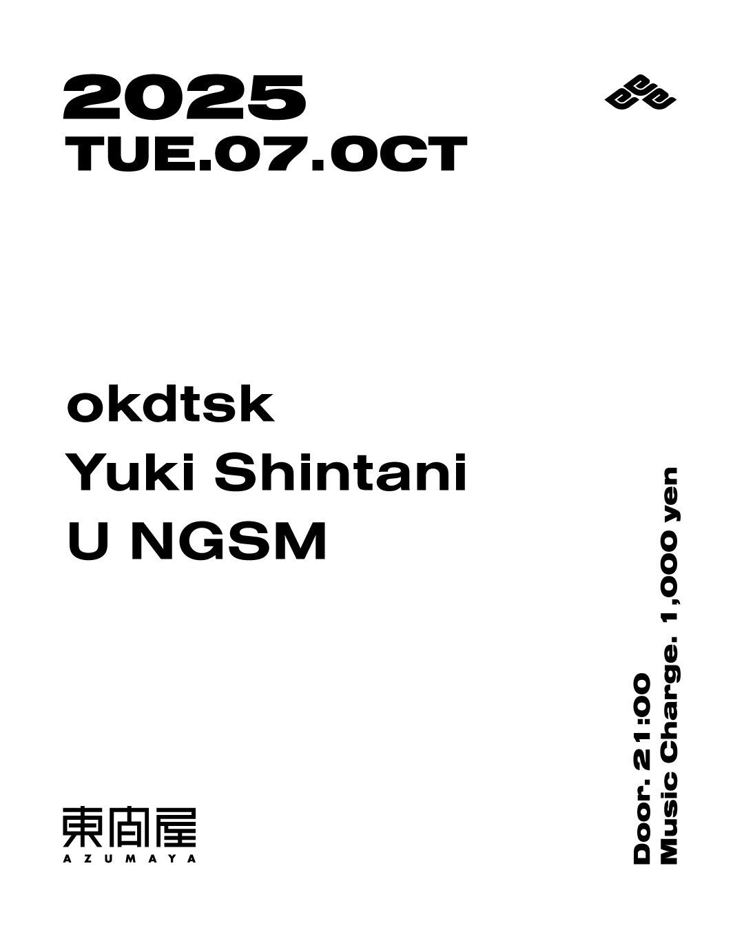 2025.10 07 OCT Azumaya -Tuesday- HOUSE 0 Shares Facebook Twitter google Line DATE: 2025-10-07 TUE OPEN: 21:00 VENUE: PRICE: Music Charge 1,000yen LINE UP: okdtsk Yuki Shintani U NGSM