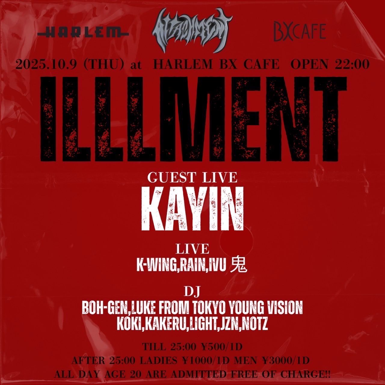 - LADIES ¥1,000/1d MEN ¥3,000/1d ※ TILL 25:00 ¥500/1d ※ AGE 20 ARE ADMITTED FREE OF CHARGE ALL DAY!!