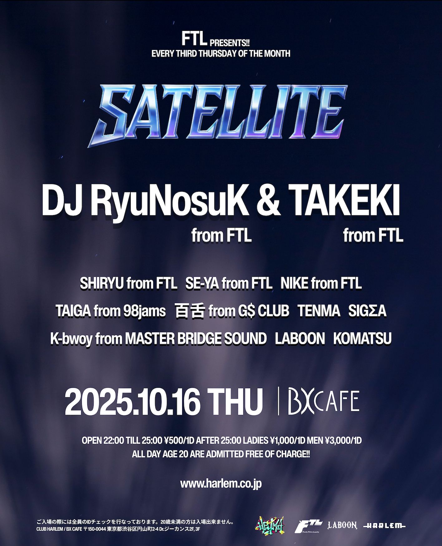 - LADIES ¥1,000/1d MEN ¥3,000/1d ※ TILL 25:00 ¥500/1d ※ AGE 20 ARE ADMITTED FREE OF CHARGE ALL DAY!!