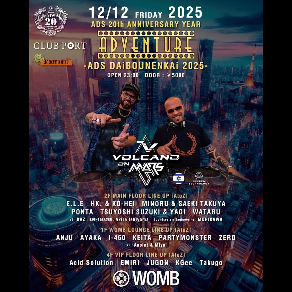 2025.12 12 DEC ADVENTURE -ADS 20TH ANNIVERSARY YEAR, ADS DAIBOUNENKAI 2025- TRANCE 0 Shares Facebook Twitter google Line DATE: 2025-12-12 FRI OPEN: 23:00 VENUE: PRICE: DOOR: ¥5000 ADVANCE TICKETS: ¥3000 (10/27 8PM-11/11) ‖ ¥3500 (11/12-12/11) LINE UP: 2F MAIN FLOOR SPECIAL GUEST: VOLCANO ON MARS (SACRED TECHNOLOGY) E.L.E, HK. & KO-HEI, MINORU & SAEKI TAKUYA, PONTA, TSUYOSHI SUZUKI & YAGI , WATARU VJ: KAZ LIGHT & LASER: AKIRA ISHIYAMA SOUNDSYSTEM ENGINEERING: MORIKAWA 1F WOMB LOUNGE ANJU(阿羅漢-ARAKAN-) AYAKA, 1-460 (TRANSCAPE RECORDS), KEITA (ATLANTIS), PARTYMONSTER (BLACKLIST BOOKING/DREAM FESTIVAL), ZERO (EXPO RECORDS/TRANCE MISSION) VJ: BIG BABY 4F VIP FLOOR ACID SOLUTION (紙とペン) EMIRI (ZENON RECORDS), JUGON (RANCHU/DUMDUM), KGEE (DTD/OUROBOROS MUSIC), TAKUGO (サイケ専門店) 3月に G.M.S を、5月に AVALON を、そして8月の SUMMER EDITION も大反響を納めた毎度満員で大盛り上がりを見せる=ADVENTURE= が毎年恒例 ADS DAiBOUNENKAi と題し2025年最後の大忘年パーティーを開催。 スペシャルゲストには、世界サイケデリックトランスのトップレーベル Sacred Technology のレーベルオーナーであり、数々のヒット曲をリリースしている大人気デュオ Volcano on Mars が日本初登場で ADS DAiBOUNENKAi 2025 に華を添える。 年一年数々の名シーンを記憶に残した ADS 20th ANNIVERSARY YEAR の最終章、ADS DAiBOUNENKAi。日本トップ DJ が WOMB に大集結。