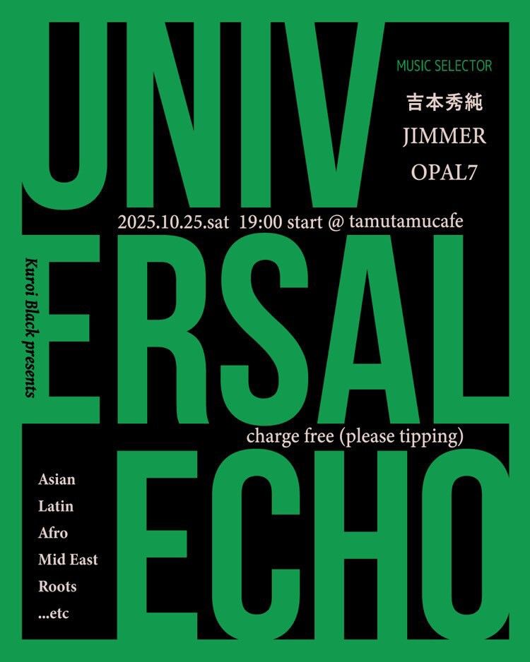 隔月tamutamucafeで開催しているKuroi Black presents EHCOシリーズの新企画として、以前のアジアンミュージックセレクションを拡大してワールドミュージックをテーマに Universal Echo と題して開催。先般BASURA MUZIKでご一緒した激渋の Vintage World Music セレクトをするJIMMER氏と、ワールドミュージックのライターとしてご活躍の吉本秀純氏をお迎えして濃度密なセレクトをお届けします。
