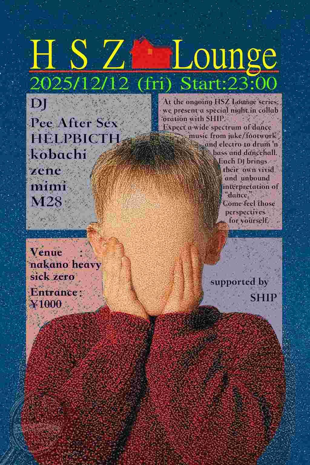 2025.12 12 DEC HSZ LOUNGE ~supported by SHIP~ JUKE FOOTWORK BASS MUSIC OTHER 0 Shares Facebook Twitter google Line DATE: 2025-12-12 FRI OPEN: 23:00 VENUE: PRICE: [DOOR]¥1,000+1Drink order LINE UP: ■DJ zene mimi Pee After Sex M28 HELPBICTH kobachi https://heavysick.co.jp/zero/