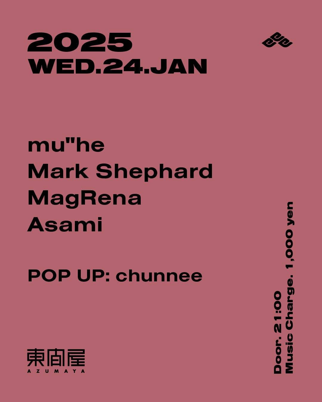 2025.12 24 DEC Azumaya -Wednesday- HOUSE TECHNO 0 Shares Facebook Twitter google Line DATE: 2025-12-24 WED OPEN: 21:00 VENUE: PRICE: Music Charge 1,000yen LINE UP: mu"he Mark Shephard MagRena Asami POP UP : chunnee