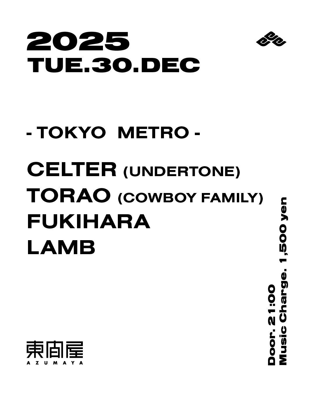 2025.12 30 DEC TOKYO METRO HOUSE TECHNO 0 Shares Facebook Twitter google Line DATE: 2025-12-30 TUE OPEN: 21:00 VENUE: PRICE: Music Charge 1,500yen LINE UP: CELTER (UNDERTONE) TORAO (COWBOY FAMILY) FUKIHARA LAMB