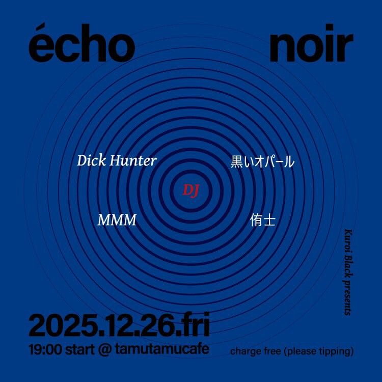 tamutamucafeで隔月のペースで電子音楽・Techno〜ワールドミュージックまで毎回素晴らしいDJを集めて開催してきてくれた『Kuroi Black presents ECHO』シリーズ!年内最後は濃厚メンツで忘年会スペシャル!入場無料投げ銭制ですのでお気軽にお越し下さい。