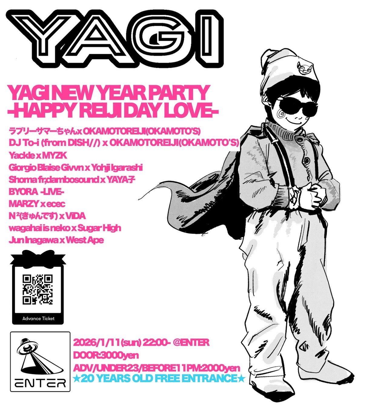 毎年恒例NEW YEAR YAGIが今年もオカモトレイジ(OKAMOTO’S)のバースデーパーティとして開催される。出演者はオカモトレイジと所縁ある出演者がスペシャルなバックトゥー(2人で一緒にDJすること)でのプレイとなる。