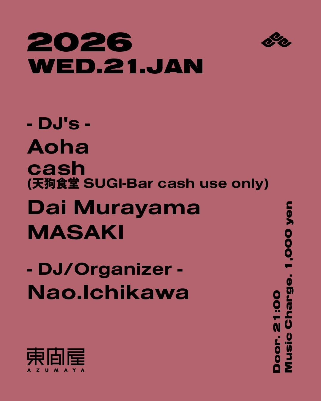2026.01 21 JAN Azumaya -Wednesday- HOUSE TECHNO 0 Shares Facebook Twitter google Line DATE: 2026-01-21 WED OPEN: 21:00 VENUE: PRICE: Music Charge 1,000yen LINE UP: - DJ's - Aoha cash (天狗食堂 SUGI-Bar cash use only) Dai Murayama MASAKI - DJ/Organizer - Nao.Ichikawa