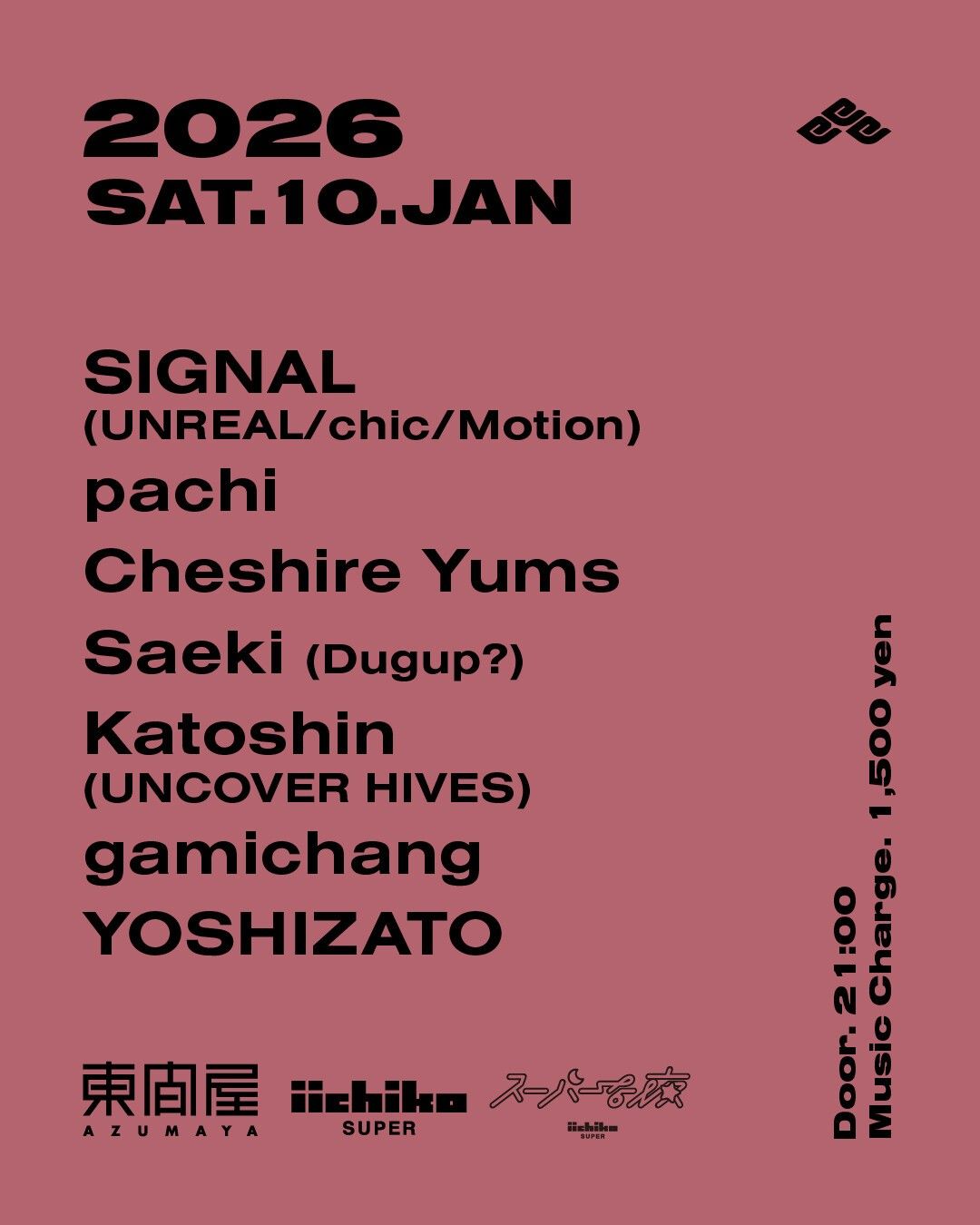 2026.01 10 JAN Azumaya -Saturday- HOUSE TECHNO 0 Shares Facebook Twitter google Line DATE: 2026-01-10 SAT OPEN: 21:00 VENUE: PRICE: Music Charge 1,500yen LINE UP: SIGNAL (UNREAL/chic/Motion) pachi Cheshire Yums Saeki (Dugup?) Katoshin (UNCOVER HIVES) gamichang YOSHIZATO