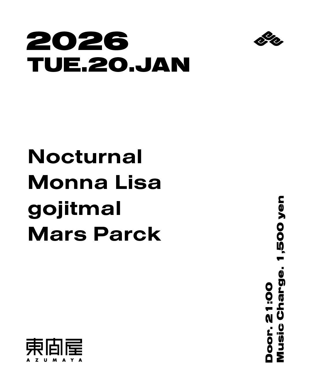 2026.01 20 JAN Azumaya -Tuesday- HOUSE TECHNO 0 Shares Facebook Twitter google Line DATE: 2026-01-20 TUE OPEN: 21:00 VENUE: PRICE: Music Charge 1,500yen LINE UP: Nocturnal Monna Lisa gojitmal Mars Parck