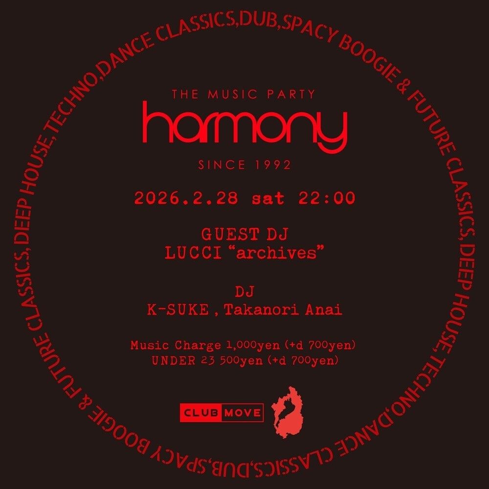 In February, HARMONY will feature 'LUCCI' from the irregularly held 'archives' at MOVE. 'LUCCI ex JUN,' who has played several times at HARMONY in the mid-90s in Kyoto, will once again DJ at HARMONY after nearly 30 years.